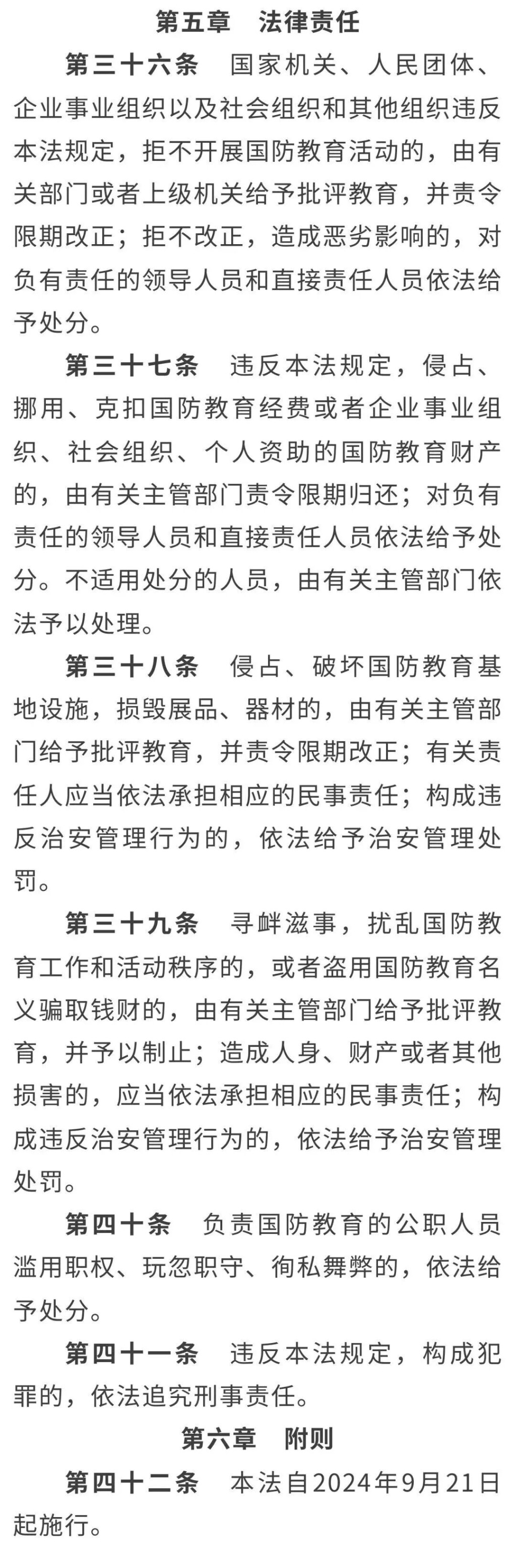 十四届全国人大常委会第十一次会议全票通过新修订的国防教育法,国家主席习近平签署第三十号主席令予以公布,自2024年9月21日起施行。