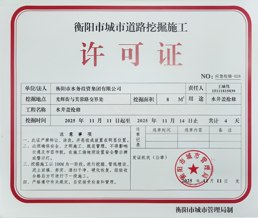 衡阳市城市道路挖掘施工许可公示(光辉街与芙蓉路交接处污水抢修)