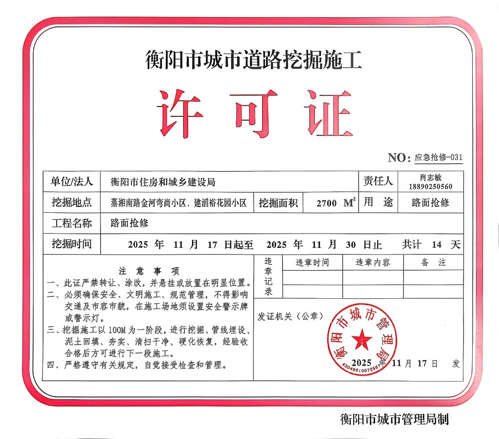 衡阳市城市道路挖掘施工许可公示(蒸湘南路路面抢修)