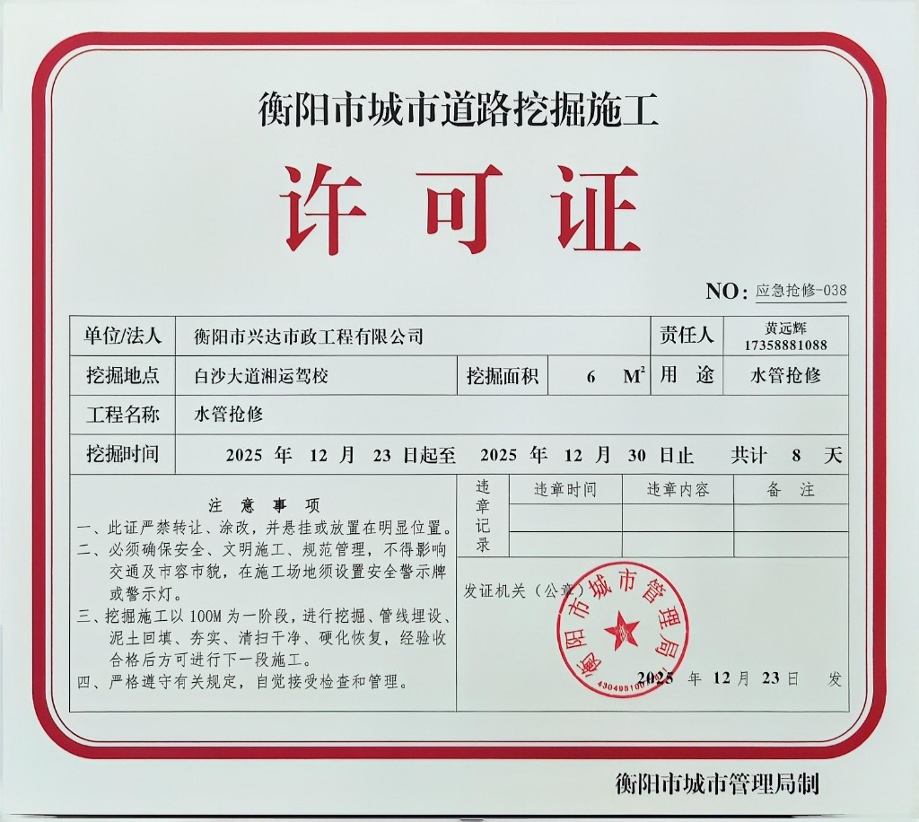 衡阳市城市道路挖掘施工许可公示(白沙大道水管抢修)
