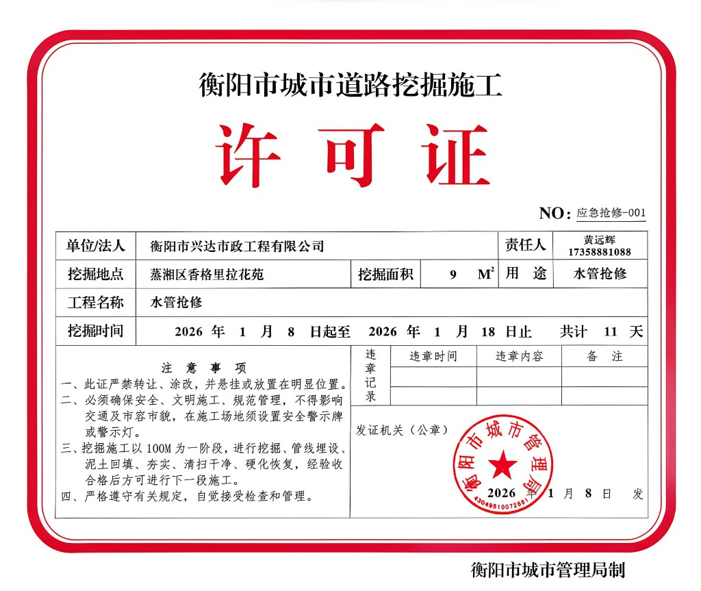 衡阳市城市道路挖掘施工许可公示(蒸湘区香格里拉花苑水管抢修)
