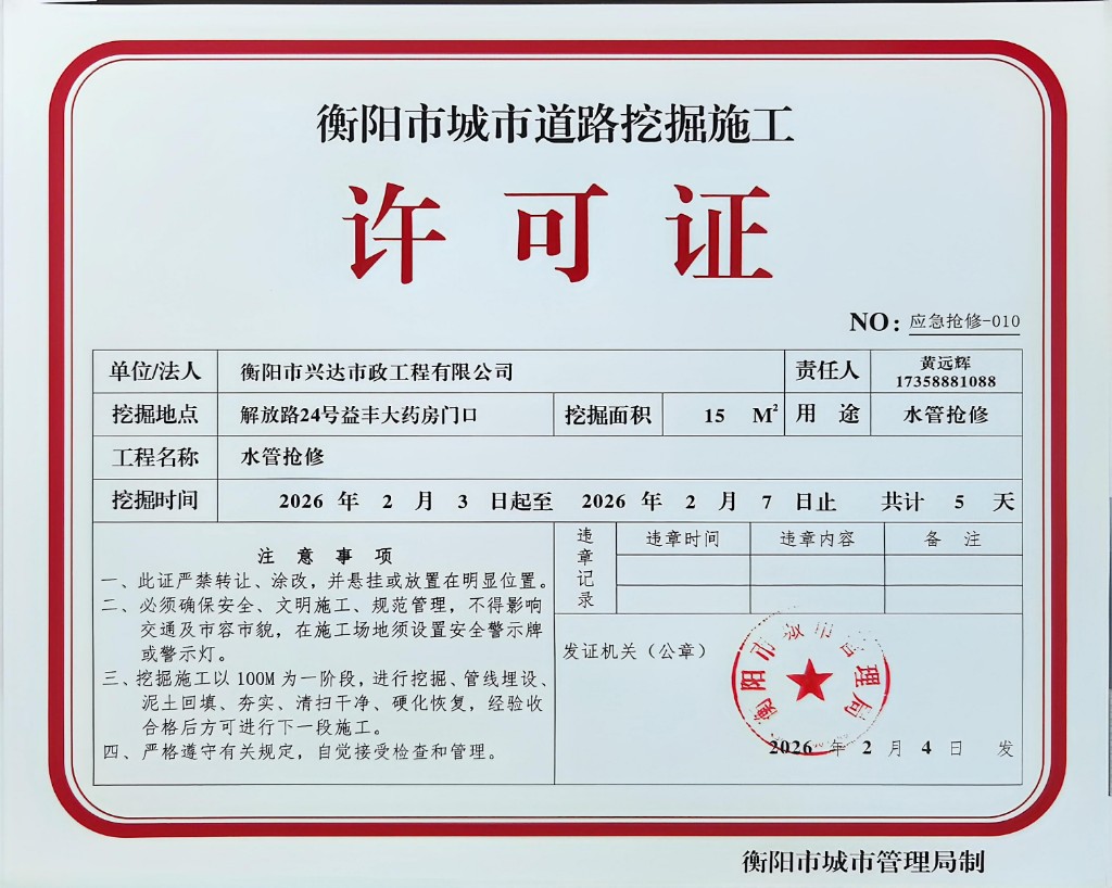 衡阳市城市道路挖掘施工许可公示(解放路水管抢修)