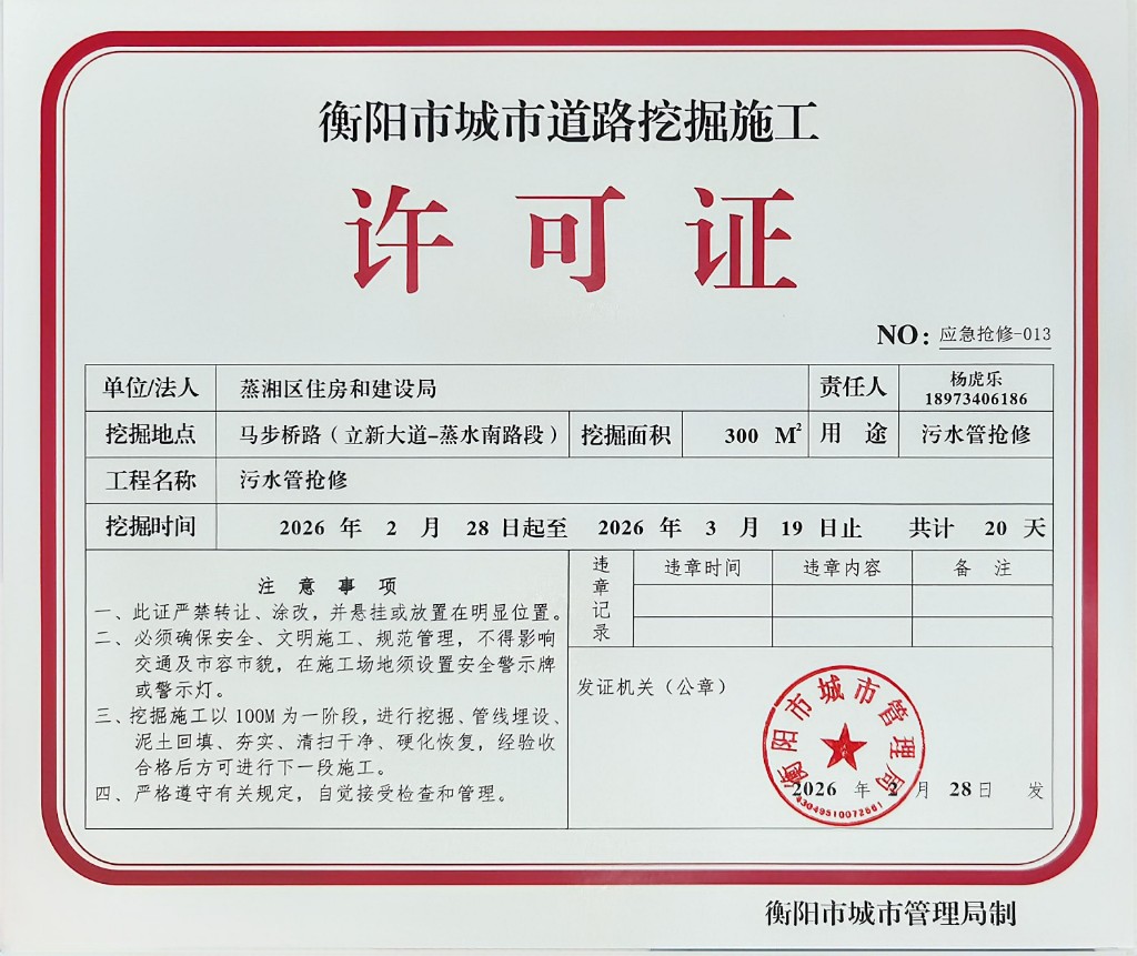 衡阳市城市道路挖掘施工许可公示(马步桥路污水抢修)