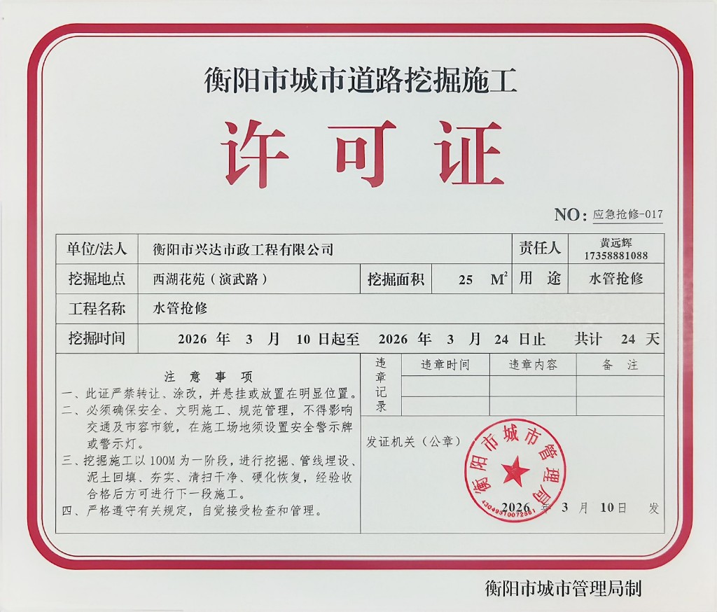 衡阳市城市道路挖掘施工许可公示(西湖花苑水管抢修)