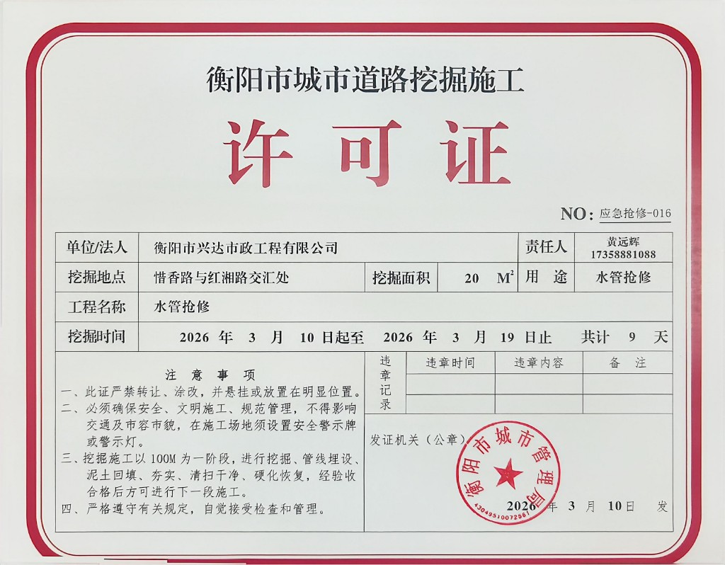衡阳市城市道路挖掘施工许可公示(惜香路污水管抢修)