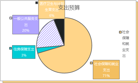 2020年支出预算6105.23万元,其中:社会保障和就业支出4297.69万元,占70.39%;住房保障支出194.03万元,占3.18%;一般公共服务支出1236.24万元,占20.25%;医疗卫生与计划生育支出377.27万元,占6.18%。较上年减少2953.46万元。