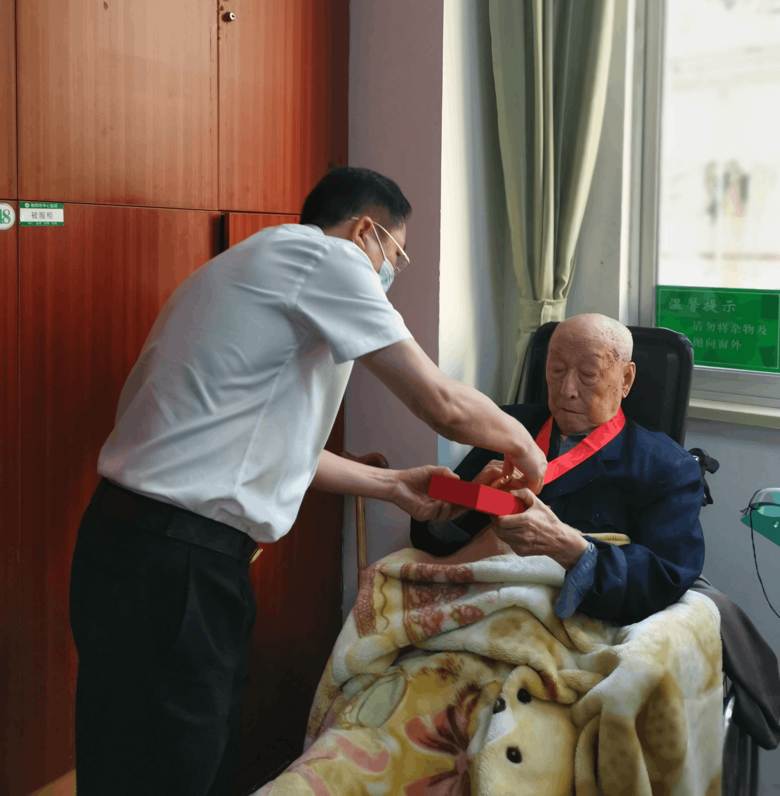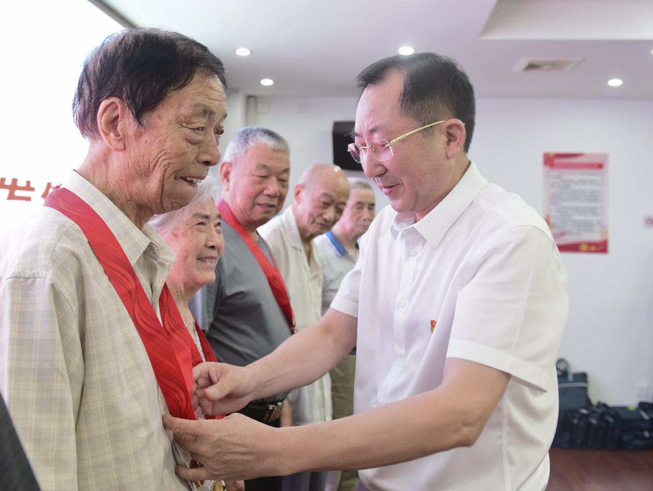 会后,他带领局机关党委和老干支部的同志来到市中心医院看望慰问未能参会的97岁高龄72年党龄的史万富老党员,并给史老颁发了"光荣在党50年"纪念章,送去了党的温暖和关怀。