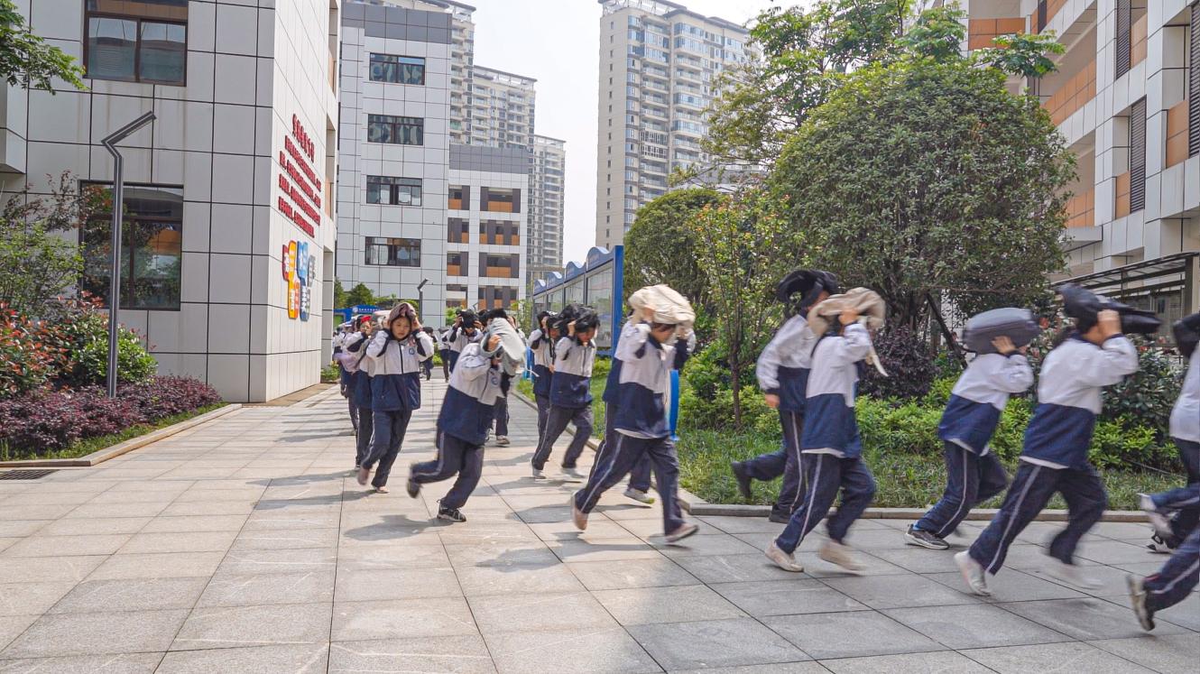 现场举行了应急避震演练和紧急疏散演练,上午9:53分,校园广播发出"地震警报"信号,演练活动正式开始。全校2684名中、小学生在统一指挥下,安全避震、迅速撤离,整个过程用时仅3分22秒。演练结束后,高新成章学校通过摆放展板、悬挂标语、发放科普宣传资料等形式进行宣传教育。