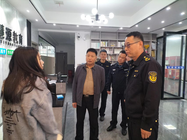 联合执法队对多家培训机构进行实地督查,对存在问题的培训机构,给予停业整顿或限期整改处理,对停办机构废旧牌匾、"僵尸"广告和流动广告、室外灯箱、电子屏等予以拆除。每到一所培训机构,罗士夫详细查看培训机构的安全管理情况,现场查验消防通道、消防栓、灭火器、安保人员执勤等。同时,还向培训机构举办者认真宣讲《校外培训行政处罚暂行办法》政策,严禁校外培训隐形变异。