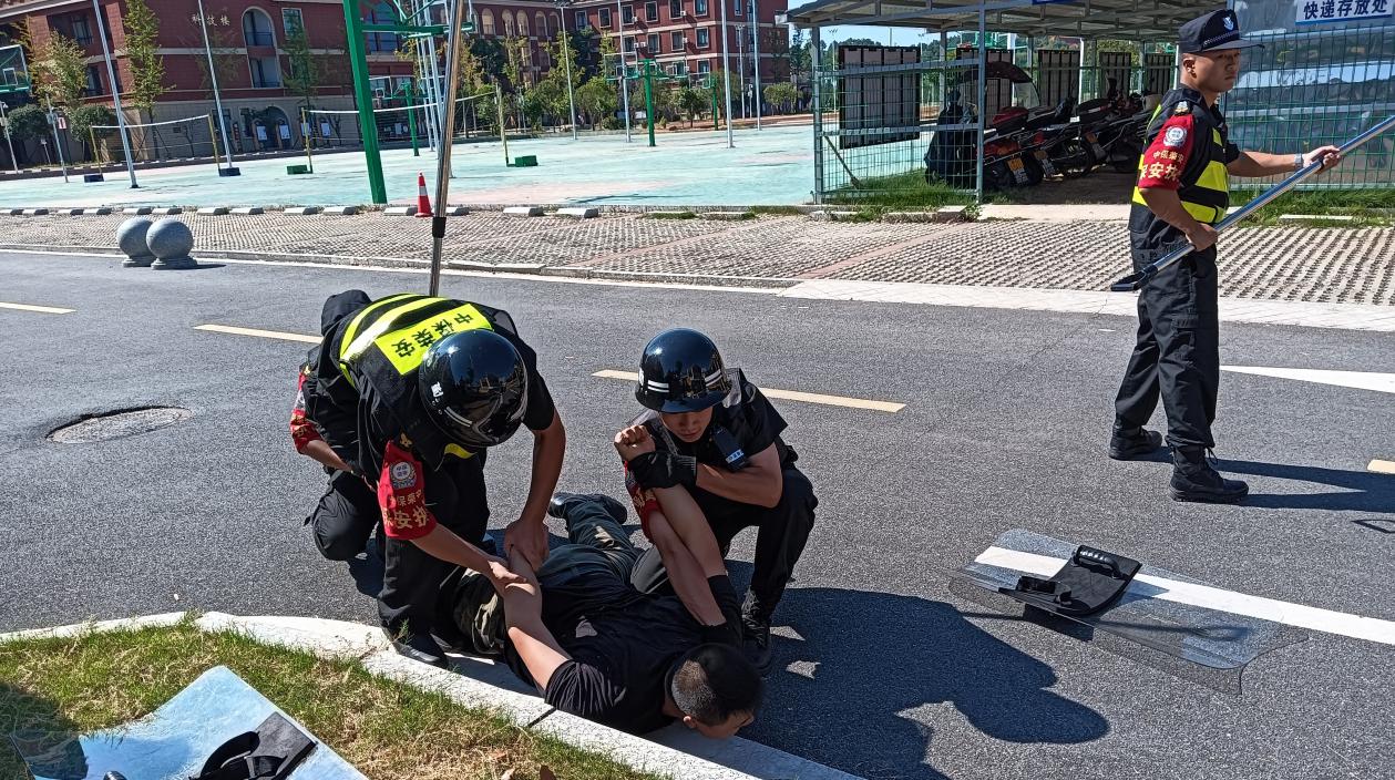 "校门有人闯卡,请求支援!"反恐防暴演练现场,正值学校课间休息时段,突然一可疑人员带刀强闯校门,值班保安立即采取应对措施,同时向学校和上级主管部门报告并启动反恐防暴应急预案。一组保安以最快的时间,将师生疏散到安全地带。二组保安在确保自身安全的前提下,与"歹徒"周旋,想方设法将其制服;如制服未果,尽量拖延时间,等待公安人员到来。同时保护好案发现场,为后期公安取证提供依据。