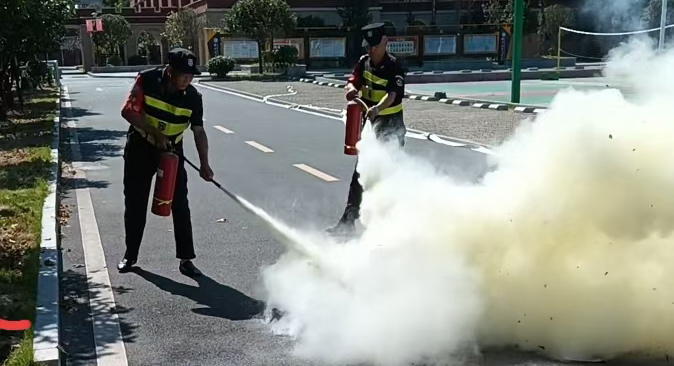 消防演练现场,在消防专干的指导下,各校安保人员分组进行50米双人水带接水实践、现场灭火器的使用教学和模拟可控制火灾现场扑救。"水带铺设时应避免骤然曲折、扭转,防止水带与有棱角的硬物体接触,充水后避免对水带强行拖拉、踩踏,压重物。""使用灭火器灭火时要站在上风方向,避免烟雾、火焰和火灾可能释放的有害气体直接吹向您,这样可以降低受伤的风险。"消防专干结合演练实践,对每一个细节问题进行耐心讲解。