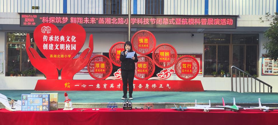 闭幕式伊始,学校教导主任对本次科技节活动进行了全面而深入的回顾。她提到,本次科技节内容丰富,形式多样,从校园内的科技作品展示到科技馆的实地参观,从紧张激烈的科技作品竞赛到闭幕式上青少年宫航模队带来的震撼表演,每一项活动都凝聚着学校领导与老师们对学生们的深切期望。希望学生们能够珍惜科学课堂,保持对科学的浓厚兴趣,勇于实践,敢于创新,用科技的力量去迎接未来的挑战,去创造属于自己的辉煌。