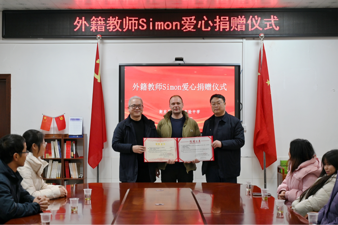 (通讯员:曾慧)2月22日,一朵以教育为名的跨国友谊之花在衡东县欧阳遇实验中学美丽绽放。这是一所地处农村乡镇的完全中学,外籍教师Simon已在这里工作一年。离校之际,他决定捐助学校一万元。此次爱心捐赠仪式在办公楼会议室举行,学校领导和教师代表出席见证。