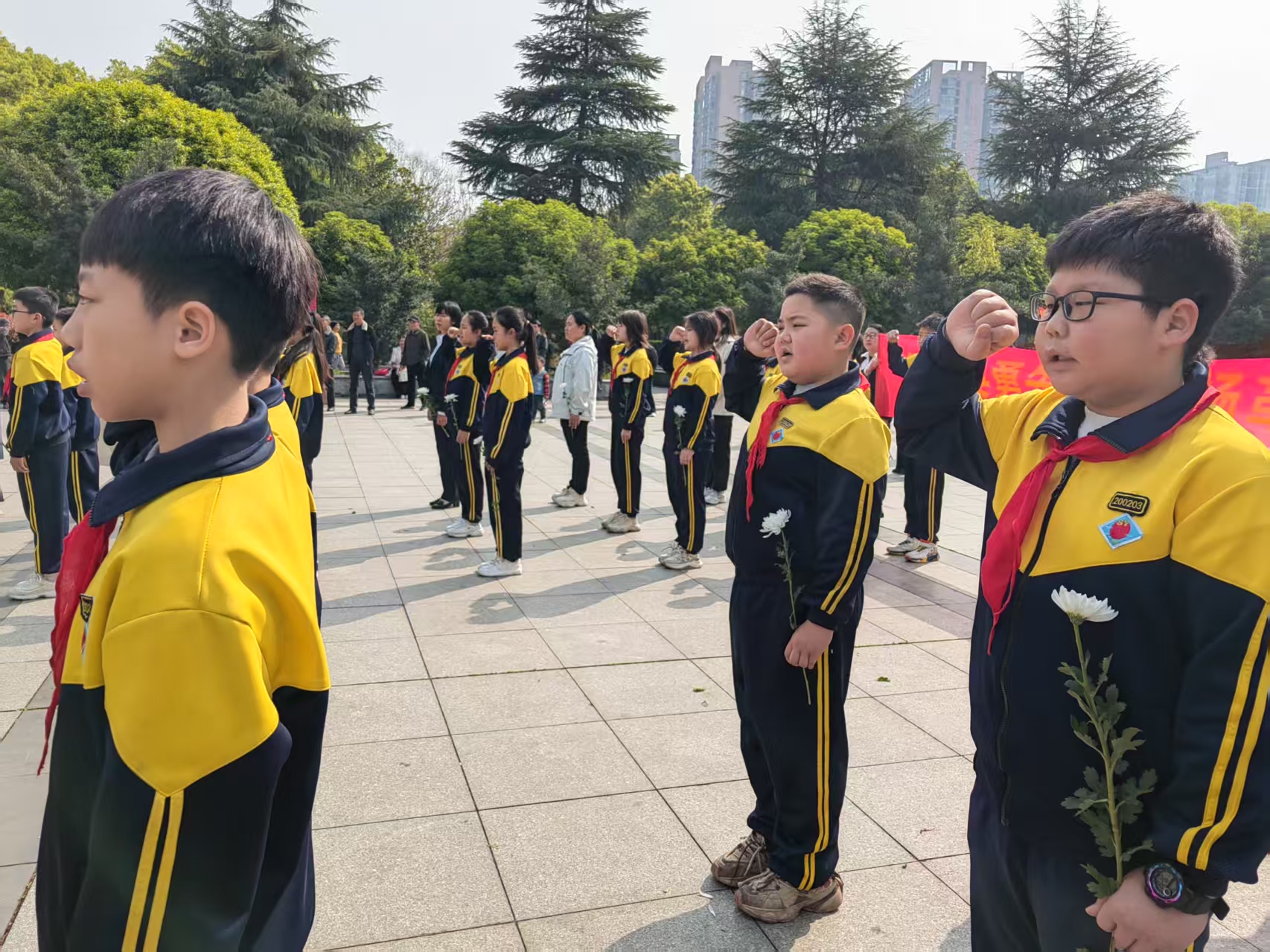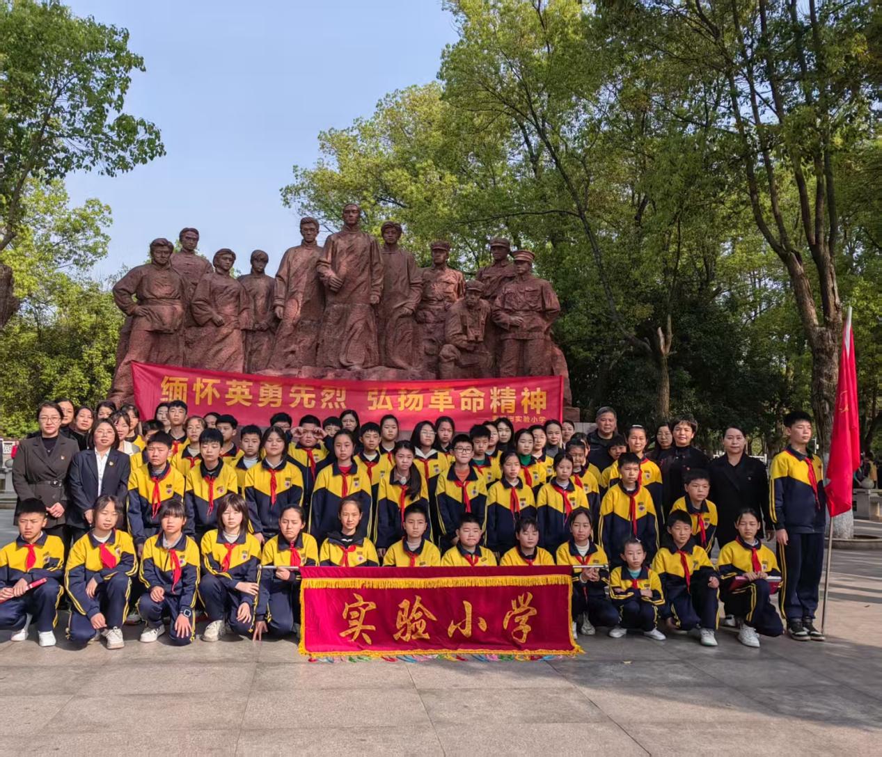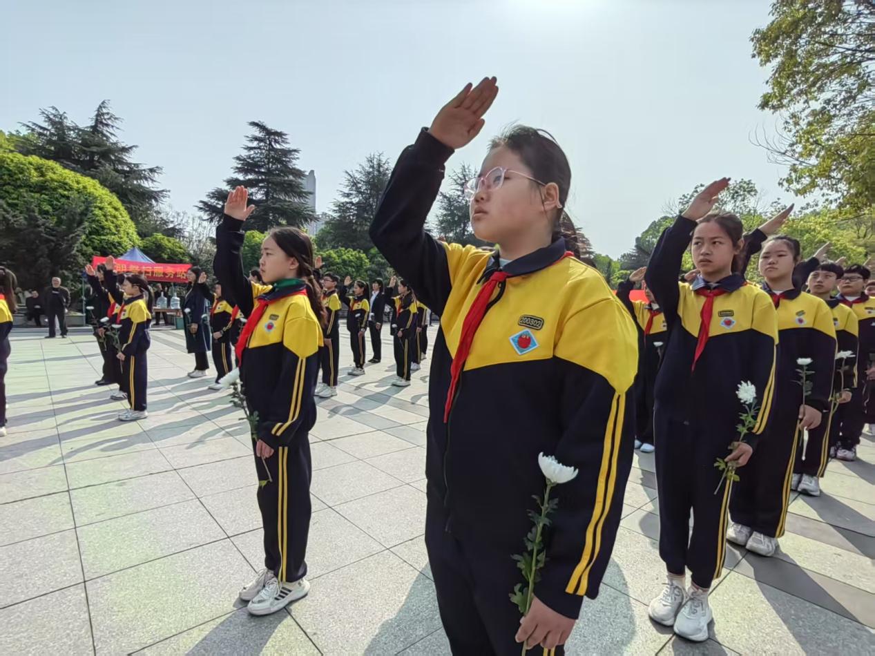 上午8时30分,烈士陵园内肃穆静谧。在铿锵的出旗曲中,3名旗手高擎少先队队旗庄严入场,全体师生齐唱《中国少年先锋队队歌》,嘹亮的歌声回荡在陵园上空。该校党支部副书记徐作荣与学生代表正步走向烈士纪念碑,敬献花圈与花篮,师生垂首默哀一分钟,深切缅怀为民族解放献出生命的英雄先烈。