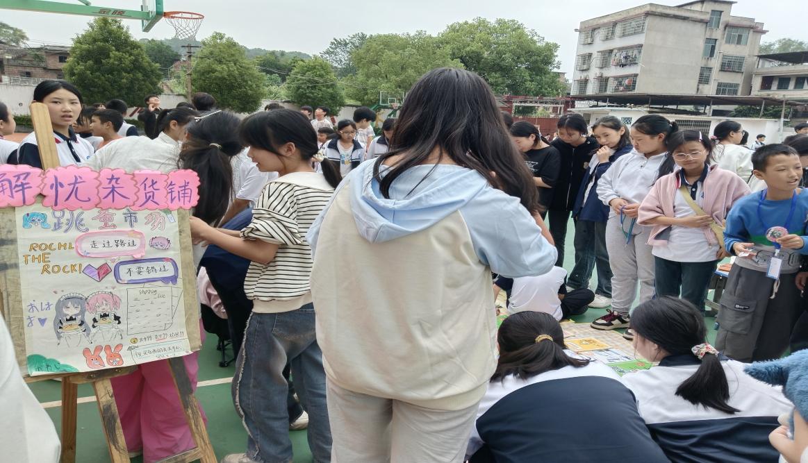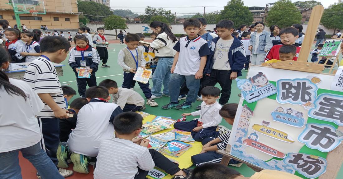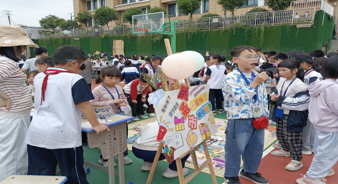 操场上,各班摊位创意十足,五彩海报、特色广告语与"买一送一""幸运大抽奖"等促销活动吸引师生们的目光。昔日专注听讲的学生化身"小老板",热情向"小书虫"们推销书籍;"小书虫"们手握零花钱,认真搜寻心仪书籍,讨价还价声与笑声交织,成交后双方笑意盈盈,完成知识与快乐的传递。