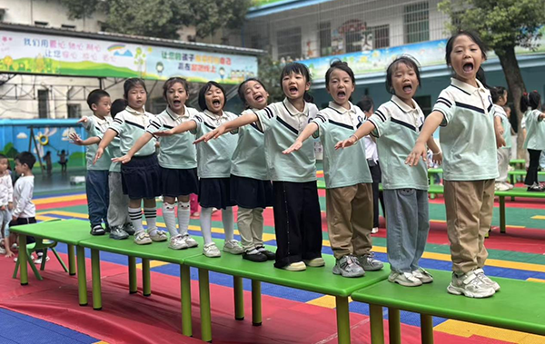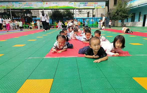 "忆征程"主题游戏将活动推向高潮。小班孩子爬"匍匐前进"垫子时,小胳膊撑得发红却咬牙往前挪,复刻着长征的坚韧;中班孩子玩"摸爬滚打",顺着滑溜布像小团子般翻滚;大一班孩子张开胳膊,跳跃挑战"展翅横空",模拟跨越障碍的勇敢;大二班孩子"翻山越岭"跨课桌时,还会主动伸手拉起同伴,学着长征战士互帮互助的模样。"胜利会师"时刻,孩子们跨过最后一道障碍时,5岁的曾乐潼蹦着欢呼:"我们像小红军一样胜利啦!"