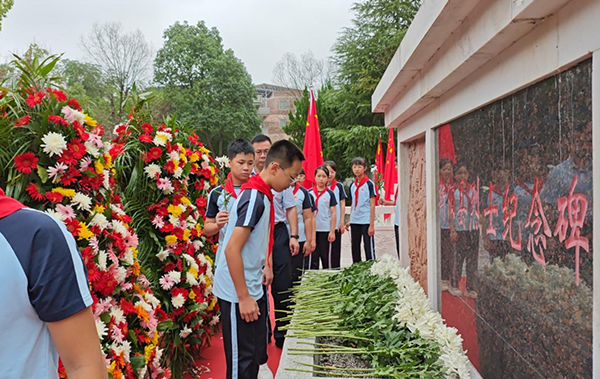 在向革命烈士行三鞠躬环节,现场少先队员们神情庄重,深深鞠躬。每一次弯腰都饱含对先烈的敬意,每一个动作都凝聚着对英雄的追思,规范的礼仪中尽显新时代少年对英烈的尊崇。仪式最后,全体人员有序瞻仰革命烈士纪念碑,少先队员们手持鲜花,轻轻摆放在纪念碑前,以朴素的方式寄托对先烈的哀思。