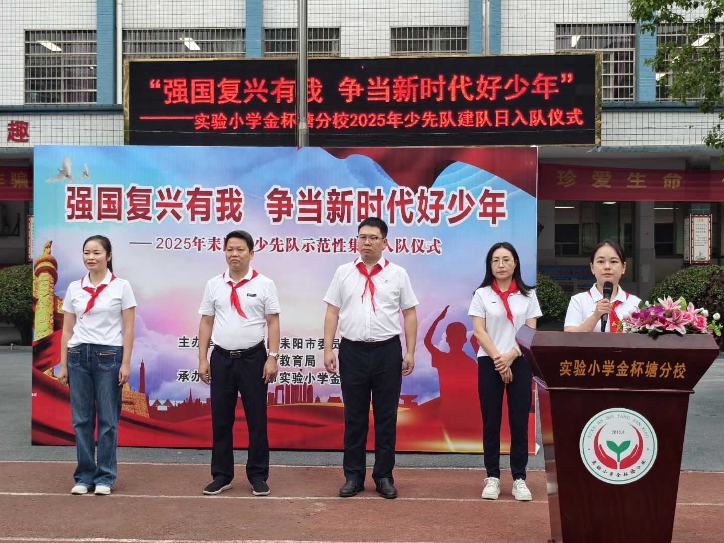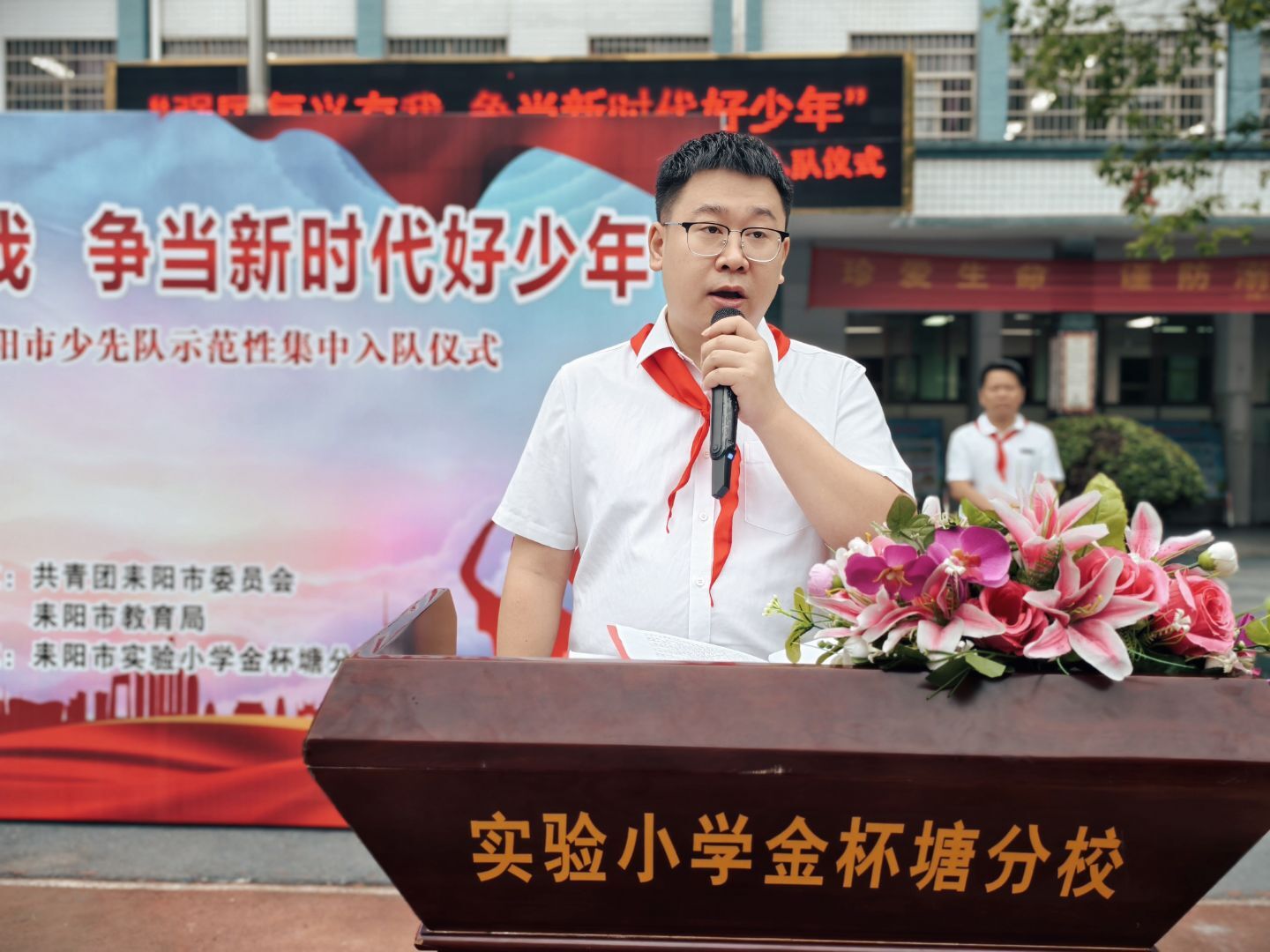 10月13日,在中国少年先锋队建队76周年纪念日来临之际,由共青团耒阳市委员会、耒阳市教育局主办的2025年耒阳市少先队示范性集中入队仪式在实验小学金杯塘分校举行,该校167名学生在星星火炬的指引下,光荣加入中国少年先锋队。共青团耒阳市委书记陈琛,耒阳市教育局党组成员、副局长罗小飞出席活动。