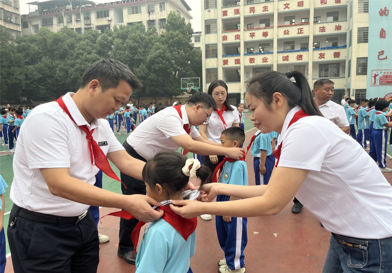 接着,该校校长唐艳霞宣读新队员名单,与会领导、老队员代表和辅导员老师给新队员授红领巾。新队员接过红领巾后,陈琛、罗小飞、唐艳霞与中队辅导员和老队员一起帮新队员系上红领巾。当鲜艳的红领巾在胸前飘扬时,新队员们的脸上洋溢着幸福与自豪。新老队员互敬队礼,象征着红色荣耀,薪火相传。