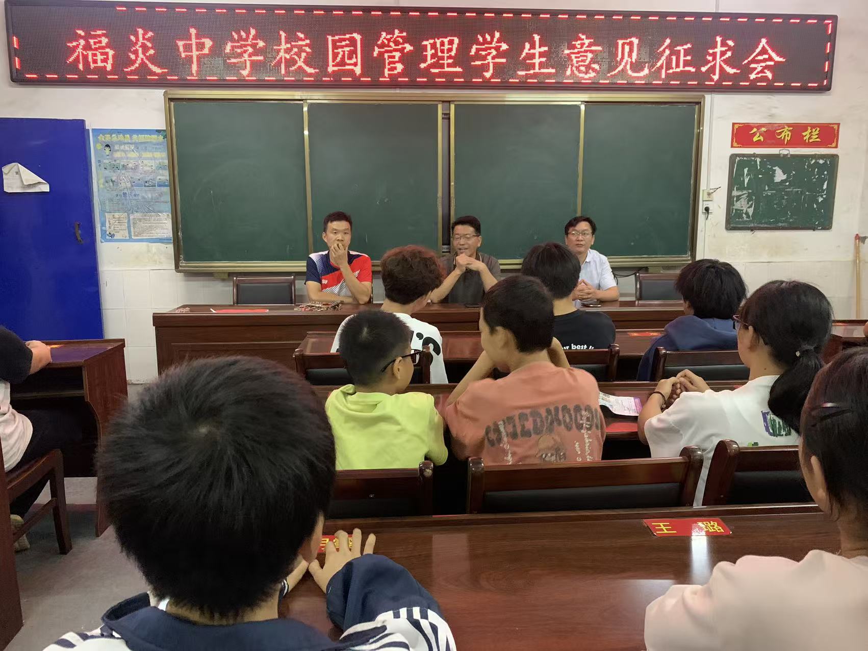 "假如是我的学生,假如我是学生",10月13日晚自习,祁东县过水坪镇福炎中学在教室会议室召开学生意见征求会。校长李朝阳、副校长彭志钢、总务主任石建军、政教主任蒋曾成及各年级学生代表共计50余人参会。
