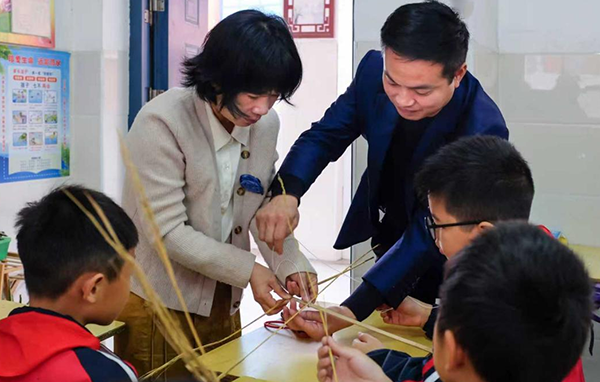 来到传统工艺课堂,学生们正专注地进行草编创作,一双双小手灵巧地穿梭在草绳之间,不一会儿就编出了精美的图案。王海燕与学生亲切交流,了解草编课程的教学内容和学生的学习收获。