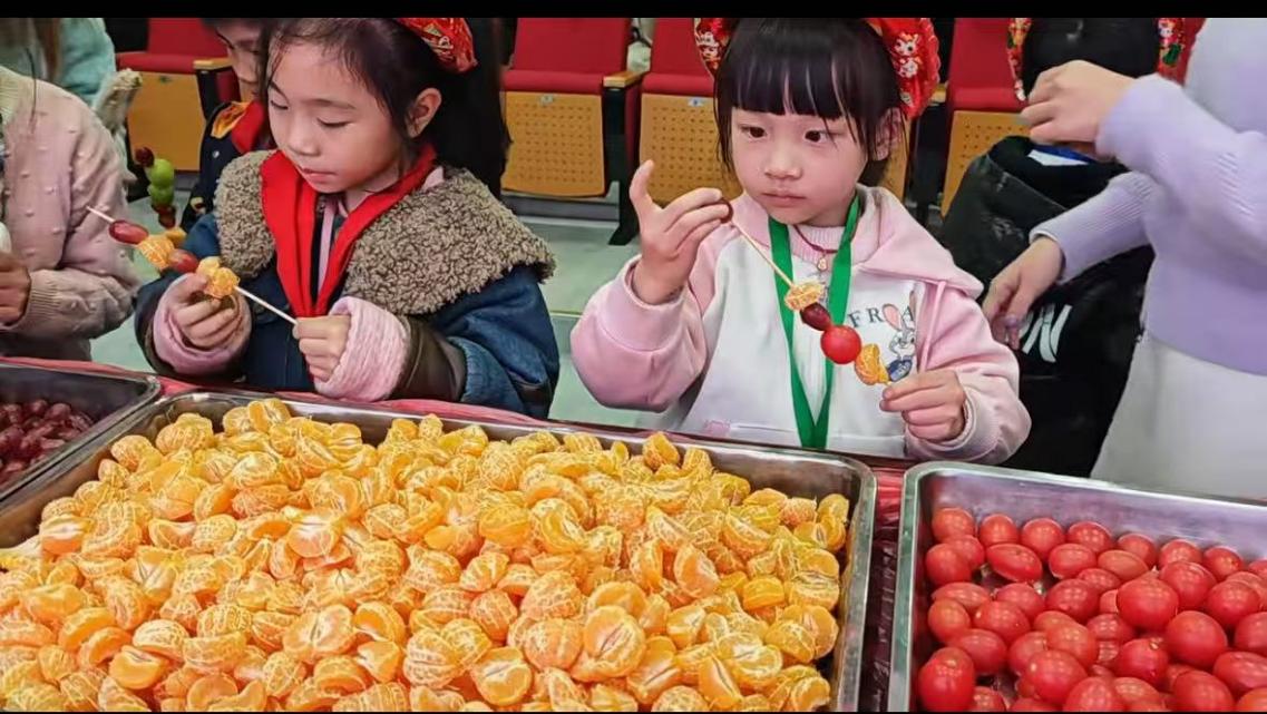 活动现场,老师提前准备好各类水果、竹签、糖浆等材料,耐心地为孩子们讲解糖葫芦的制作步骤。从挑选水果、小心串签,到淋裹糖浆、冷却定型,每一个环节都有老师手把手指导。孩子们眼神专注,跟着老师的节奏一步步操作,有的孩子小心翼翼地将桔子、葡萄串成串;有的孩子认真地转动竹签让糖浆均匀包裹,尽管动作略显生疏,却满是投入与认真。