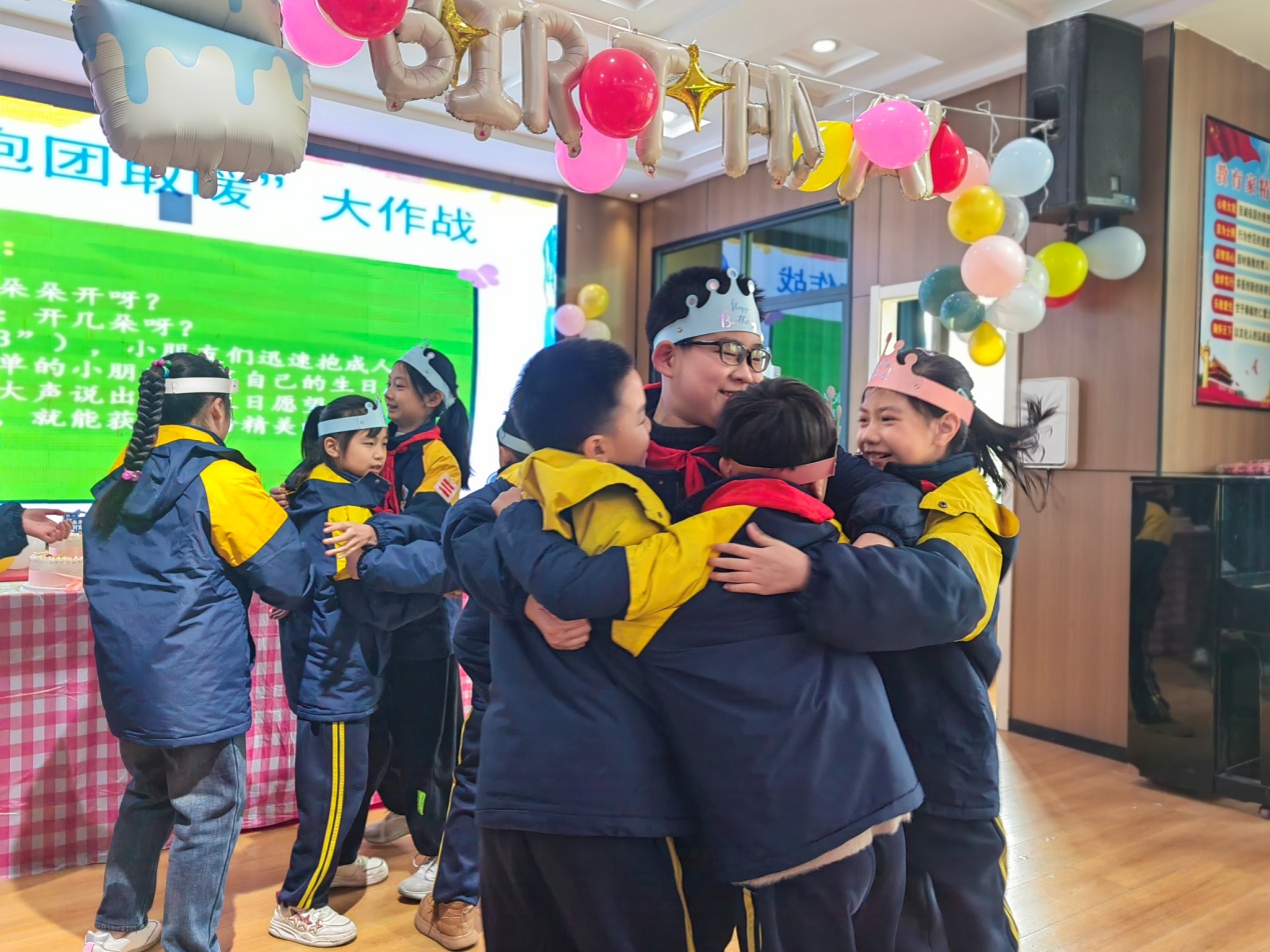 随后进行的"抱团取暖"游戏,将生日的热闹推向高潮。随着音乐声起,孩子们手拉手围成圈走动;音乐一停,主持人喊出数字,他们便立刻按人数紧紧抱成一团。从最初的害羞,到后来笑着、跑着寻找"伙伴",多媒体室里充满了欢快的尖叫和拥抱的温暖。