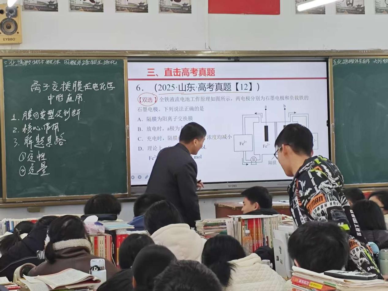 课堂上,邹双国紧扣高考导向,精准拆解考点逻辑。他从离子交换膜的核心原理切入,延伸至其在电化学体系中的具体应用,讲解层层递进、脉络清晰。他特别注重与高考衔接,通过数据呈现该考点在近年高考试题中的分布规律与分值占比,帮助学生准确把握备考重点,并以经典高考真题为载体,现场解析题型特点、解题思路与得分技巧,将抽象的化学原理转化为可操作的应试方法,增强了课堂的实用性。