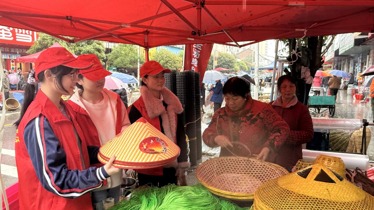 渣江"赶二八"历史悠久,盛于清朝,主要为新的一年农业生产特别是春耕生产做准备,交易的产品以农具、农资、土特产等为主,是衡阳市级非物质文化遗产,承载着湘南地区深厚的农耕记忆与民俗风情。活动中,学生志愿者认真聆听老农人讲解"赶八""赶社""赶戊"的历史渊源,感受从土地祭祀到寿佛祝寿、社戏展演、农耕贸易的民俗演变;认真记录民俗活动流程、商品交易等细节。休息之余,大家还品尝了渣江米粉、假羊肉等特色美食,近距离触摸地道的乡土烟火气。志愿者们在沉浸式体验中学习传承本土民俗文化,深刻感悟家乡文化的独特魅力。