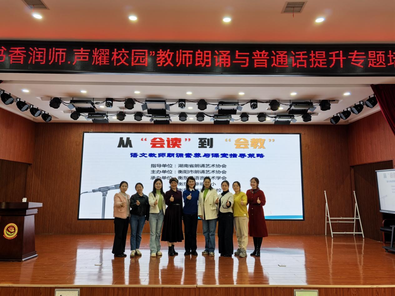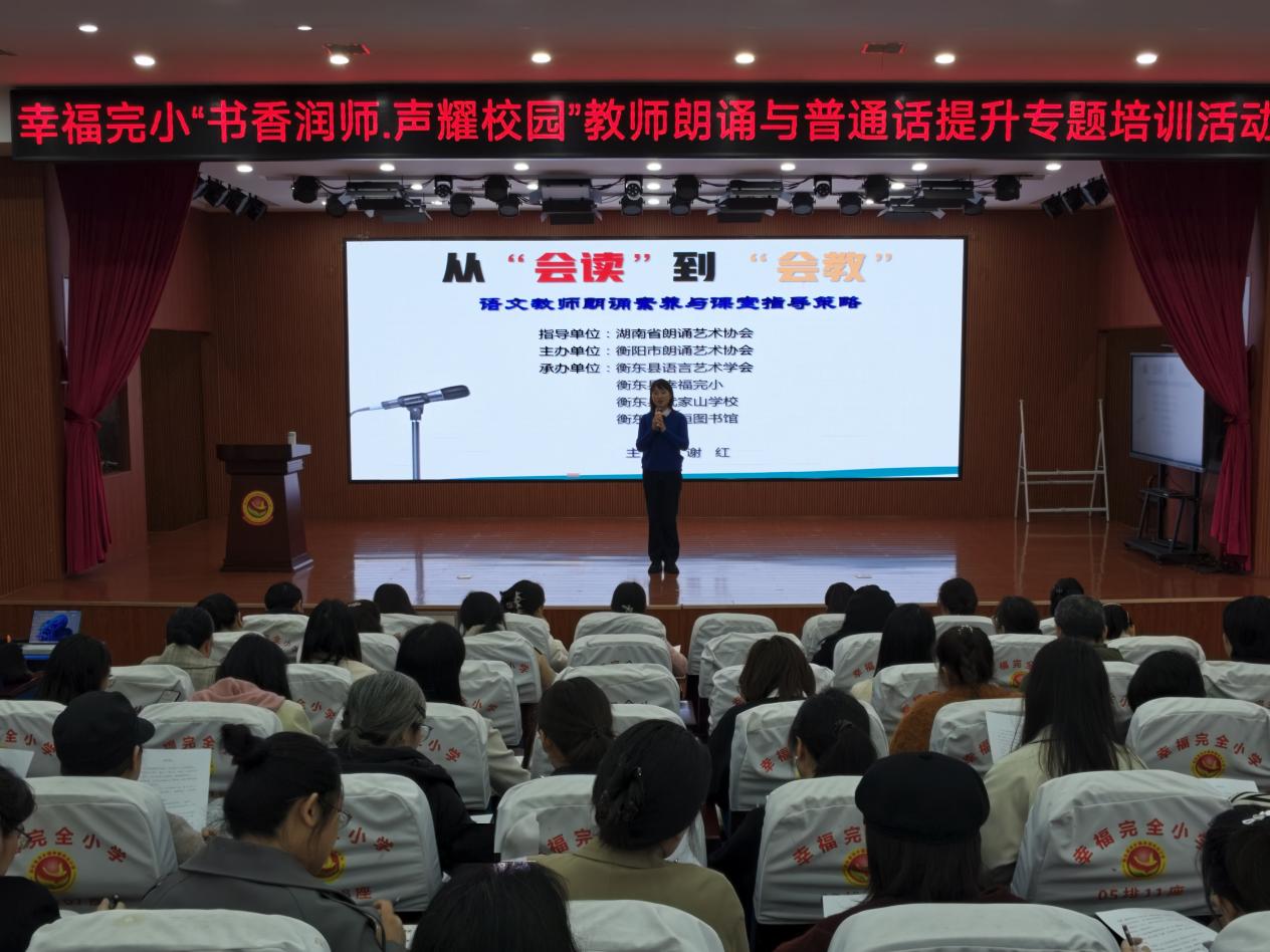 衡东县洣水镇幸福完小开展"书香润师·声耀校园——朗诵艺术与普通话水平提升专题培训",特邀湖南省朗诵协会主席谢红莅临指导,全体教师齐聚学校报告厅,共赴一场以声传情、以读促学的文化盛宴。
