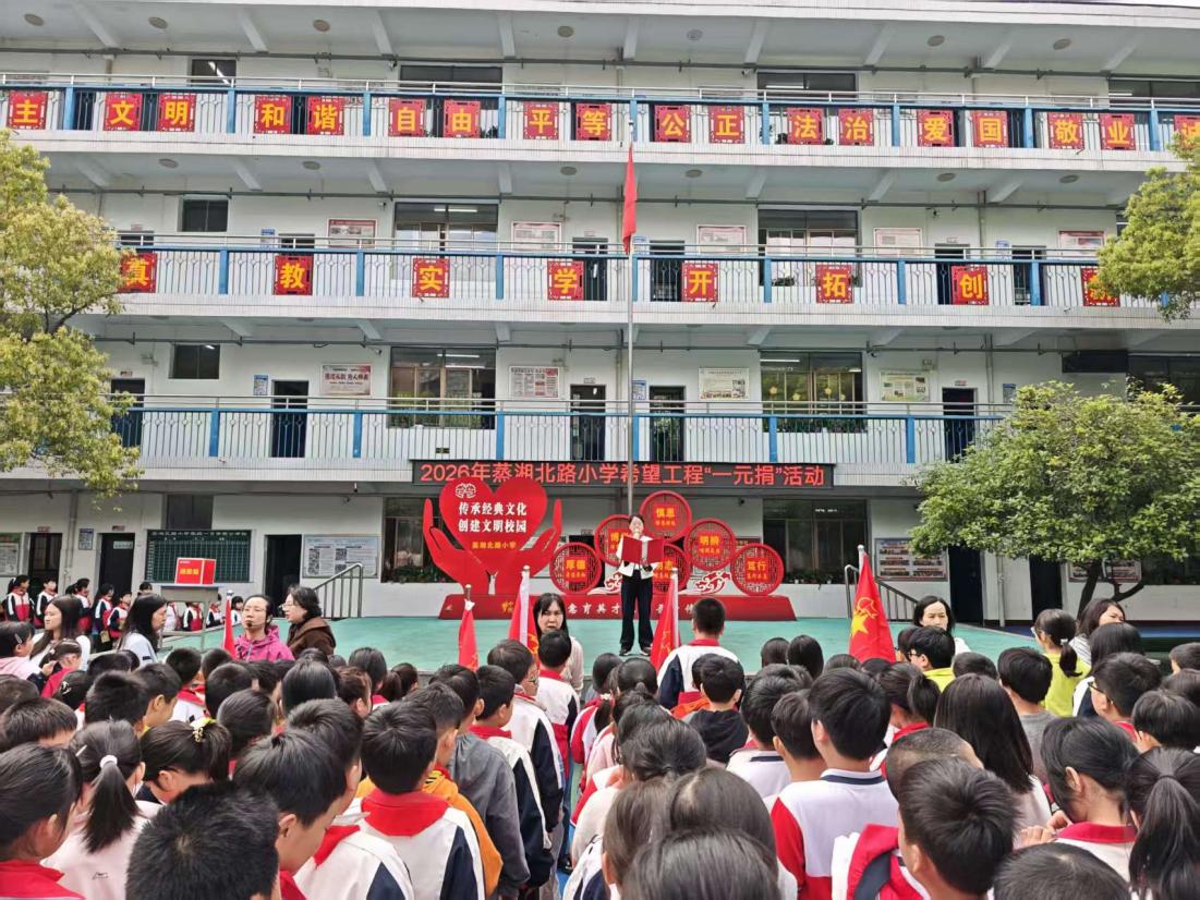 (通讯员:秦喆 严仇 谭雯) 为培养师生的公益爱心与社会责任感,传递温暖与希望,4月23日上午,蒸湘北路小学精心组织开展了希望工程"一元捐"公益捐款活动。全校师生积极响应,用小小的善举汇聚起磅礴的爱心力量,为需要帮助的儿童送去关怀与祝福。