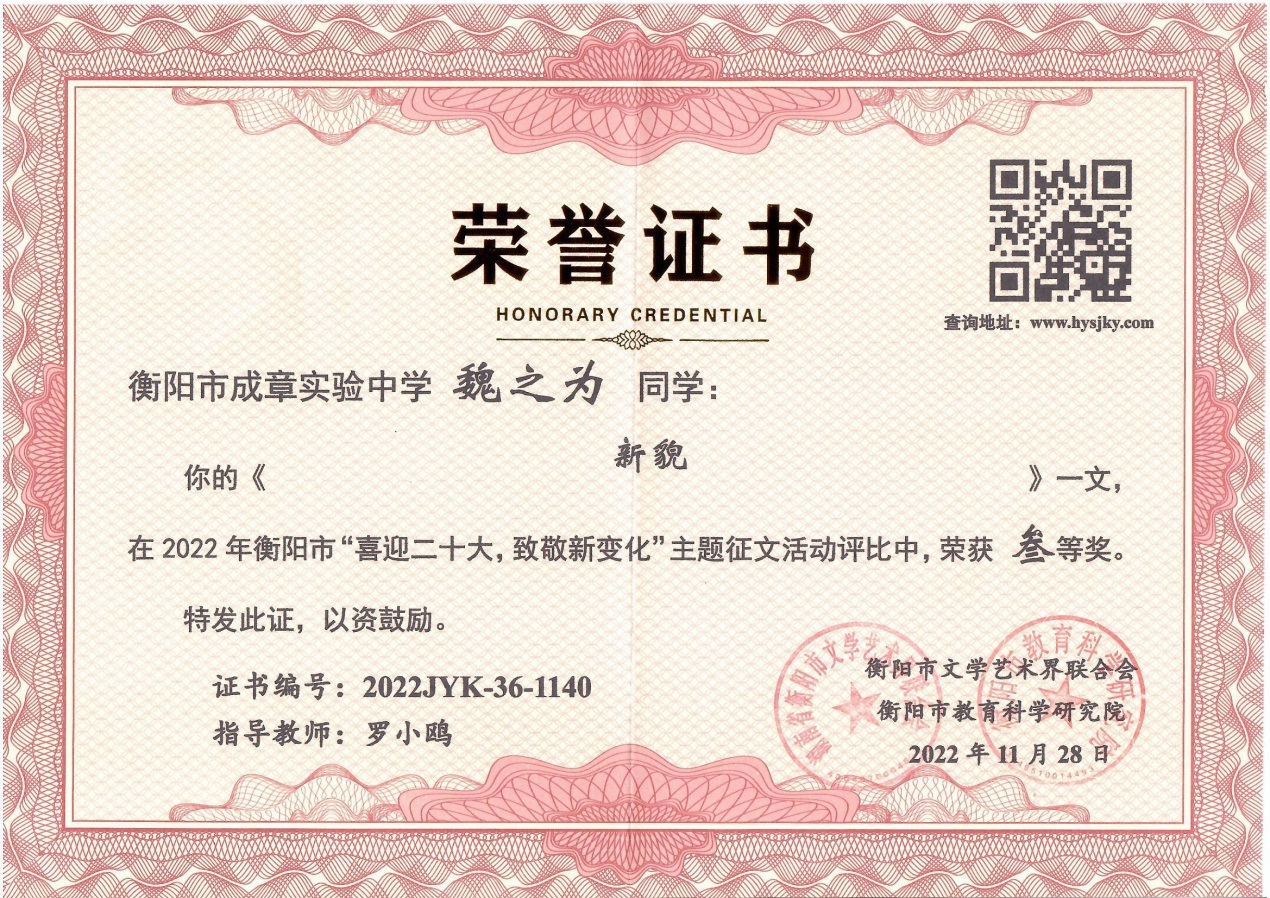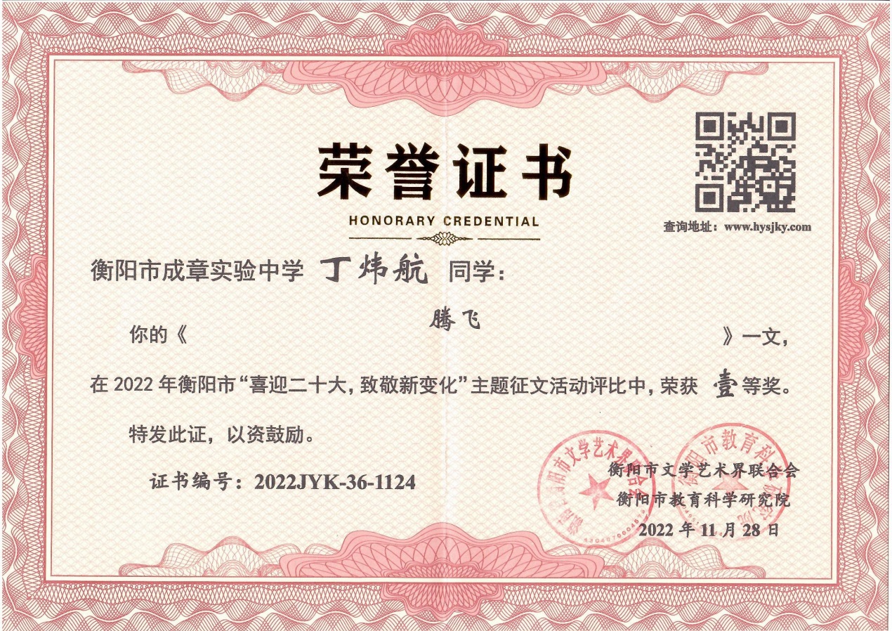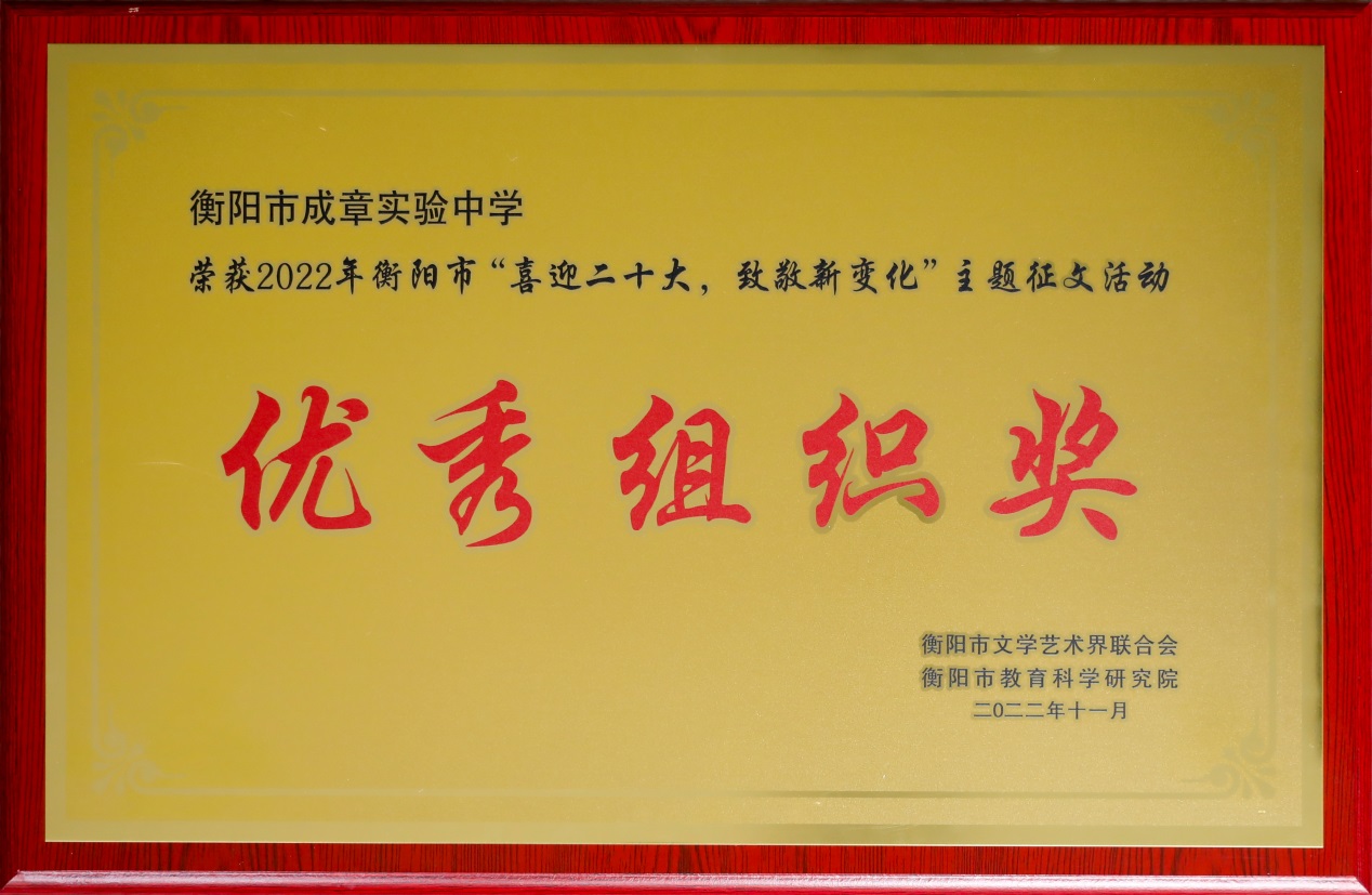 本次主题征文活动由衡阳市文学艺术界联合会、衡阳市教育科学研究院联合主办。衡阳市成章实验中学419班丁炜航在本次活动中荣获一等奖,487班魏之为荣获三等奖。衡阳市成章实验中学荣获优秀组织奖。