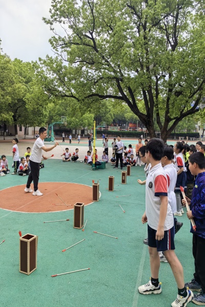 他通过热身活动,快乐传导,将队员们分组进行投壶游戏,投壶是一项古老而有趣的传统体育运动,把箭向壶里投,投中多的为胜,是古人用来提高人的注意力、增强身体协调能力的活动。每个队员发五支箭,投中计分,队员们站在指定位置,目光盯准壶口,屏心静气,用力投掷,中了喝彩,不中,加油击掌鼓劲,现场队员热情高涨,在欢声笑语中玩出了自我、玩出了新意,在尽情玩耍中,释放了天性,快乐的游戏让队员积极融入到团体中,充分体验团体氛围的美好。