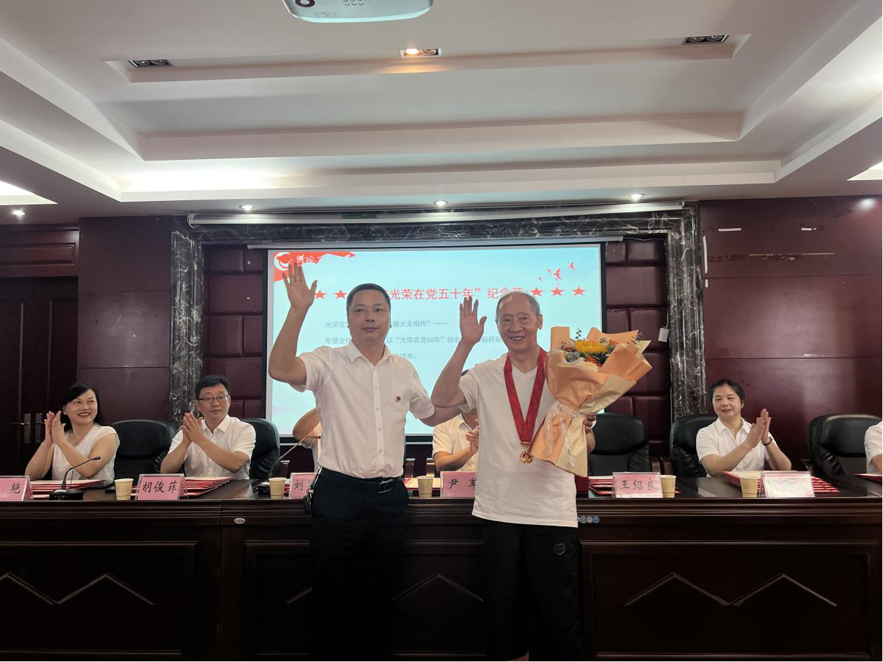 王绍良校长为"光荣在党50年"的老党员曹中书同志颁发鲜花与纪念章。"光荣在党50年"的老党员夏庚成同志因身体原因未能来到表彰会现场。