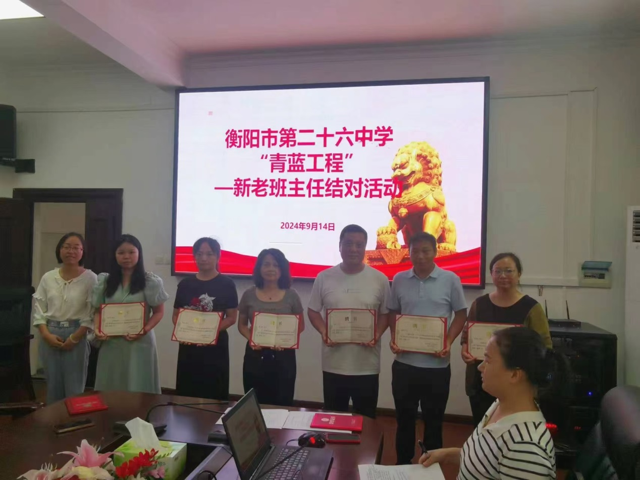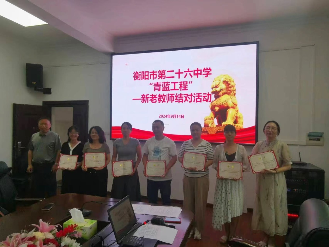 为进一步提升教师队伍整体素质,实现教师队伍"师徒结对、以老带新、以新促老、共同提高"的目标,9月14日下午,衡阳市第二十六中学隆重举行新学年"青蓝工程"师徒结对仪式。活动由教务处副主任包露主持,全体校领导、学校部分骨干教师及近两年新进教师参加会议。