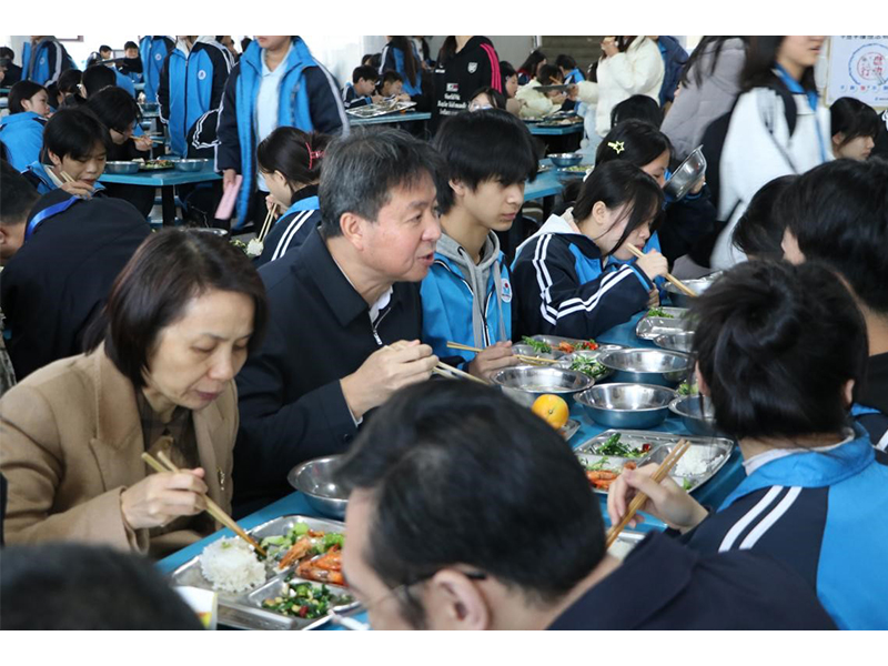 午餐期间,谢宏率调研工作组在学校食堂与学生们同桌就餐,听取学生们对饭菜质量的意见。就餐过程中,谢宏和学生们亲切交谈,不仅询问了解"校园餐"的营养搭配和学生对食堂饭菜的满意度,还和同学们谈学习、谈生活。同学们纷纷表示,这顿中餐不仅吃得有味、更吃得暖心,倍感温馨。