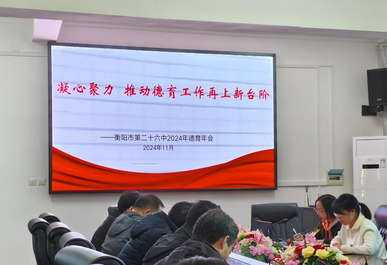 为贯彻落实立德树人的根本任务,提高班主任德育工作水平,营造积极向上的育人氛围,11月29日,衡阳市第二十六中学围绕"凝心聚力,推动德育工作再上新台阶"主题召开了2024年度德育年会。此次会议由学生处主任陈公平主持,学校全体行政人员、班主任参加。