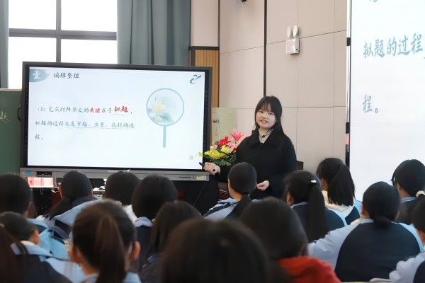 成章实验中学陈添凤老师将目光聚焦于"材料作文拟题"这一关键点开展复习教学。陈老师以"一见钟情"为引子,指出学生拟题出现的"标题过长或过短、偏离题意、大而空泛、故弄玄虚"的四个误区,并结合中考真题巧妙地传授拟题诀窍,点亮了学生们的创作灵感。