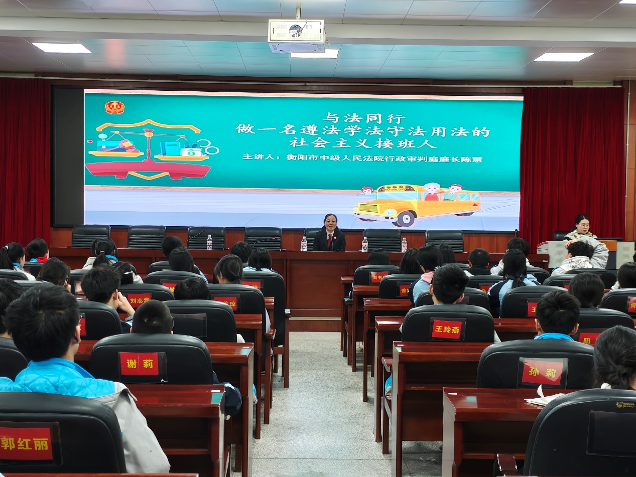 (通讯员:李颖)为扎实做好青少年法治教育工作,培养青少年尊法、学法、守法、用法意识,衡阳市实验中学于3月19日特邀衡阳市中级人民法院行政审判庭庭长陈慧法官,为全体师生开展了一场主题为"与法同行,做一名遵法学法守法用法的社会主义接班人"的普法宣传活动。
