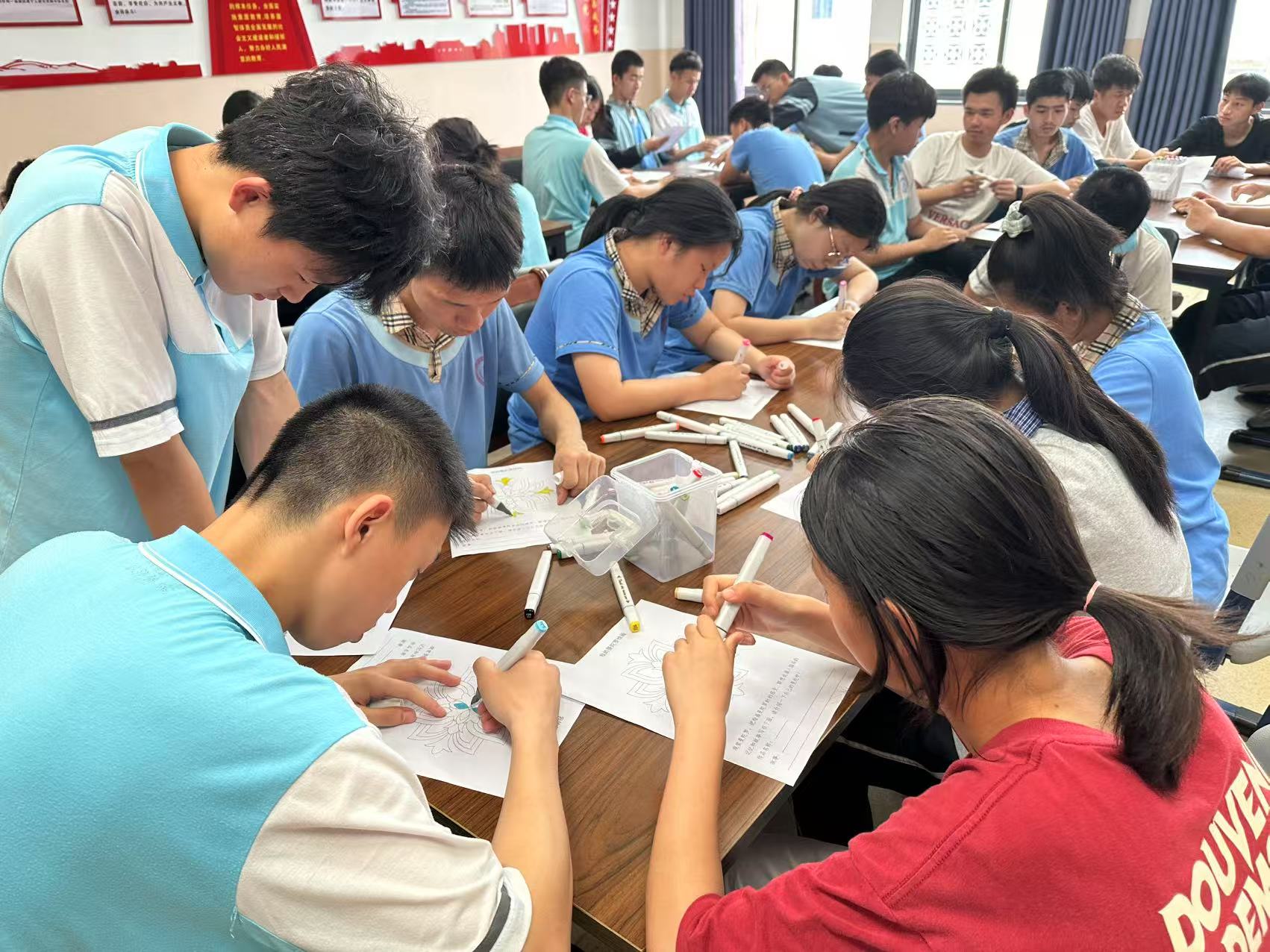 活动现场,学生们在心理老师的专业引导下,通过曼陀罗绘画开启自我探索。他们手持画笔,以斑斓色彩在画纸上精心勾勒出内心"压力与勇气"交织的图景。画面中浓烈的色彩碰撞、鲜明的对比呈现,宛如无声的语言,细腻诉说着学生们内心深处的真情实感。心理老师则全程耐心陪伴,细致观察学生们的绘画过程与作品细节,与大家谈心交流。随后,"气球爆破传递匿名纸条"环节惊喜上演。当气球被踩破,匿名赞美纸条如雪花飘落,纸条中同伴的认可温暖着众人。活动尾声,"一周自我关怀计划"能量包成焦点,学生们将成长承诺贴在成长树上,"允许重来"的承诺激励大家积极面对生活挑战。
