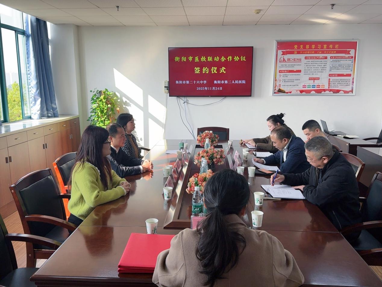 为深入贯彻"健康中国"战略部署,深化"医校共建"育人机制,全面提升师生心理健康素养,筑牢青少年心理防护屏障,11月24日,衡阳市第二十六中学与衡阳市第二人民医院(衡阳市精神卫生中心)隆重举行医校合作签约仪式。衡阳市第二人民医院党委书记李伟、副院长范雅星、纪委书记吴永进、副院长林侨、科教科科长贺丽,衡阳市第二十六中学校长谭永、纪委书记倪玉婷、心理教师谷彤玲等共同出席,见证这一兼具里程碑意义的合作时刻。