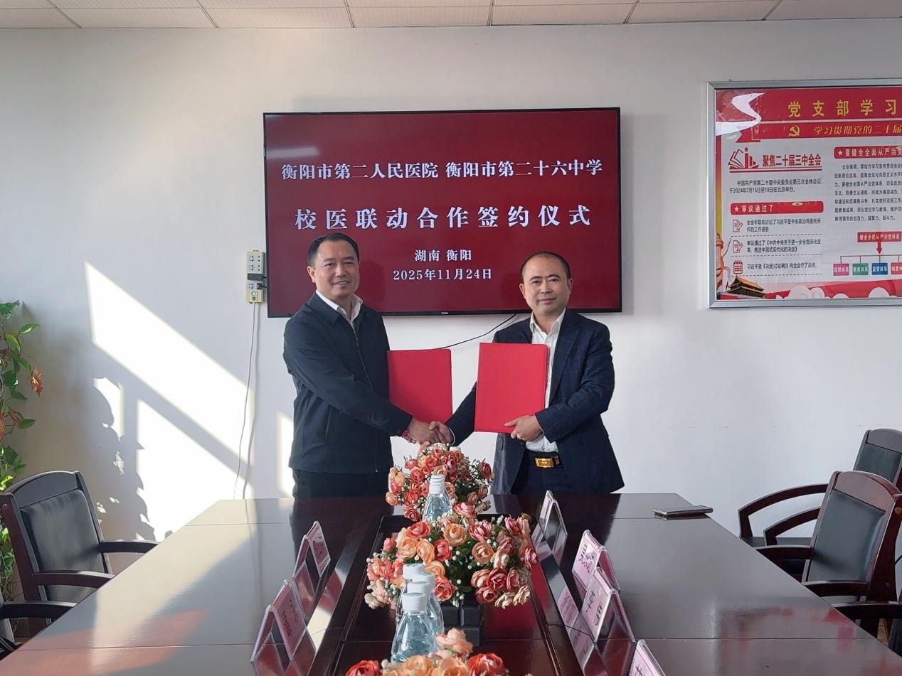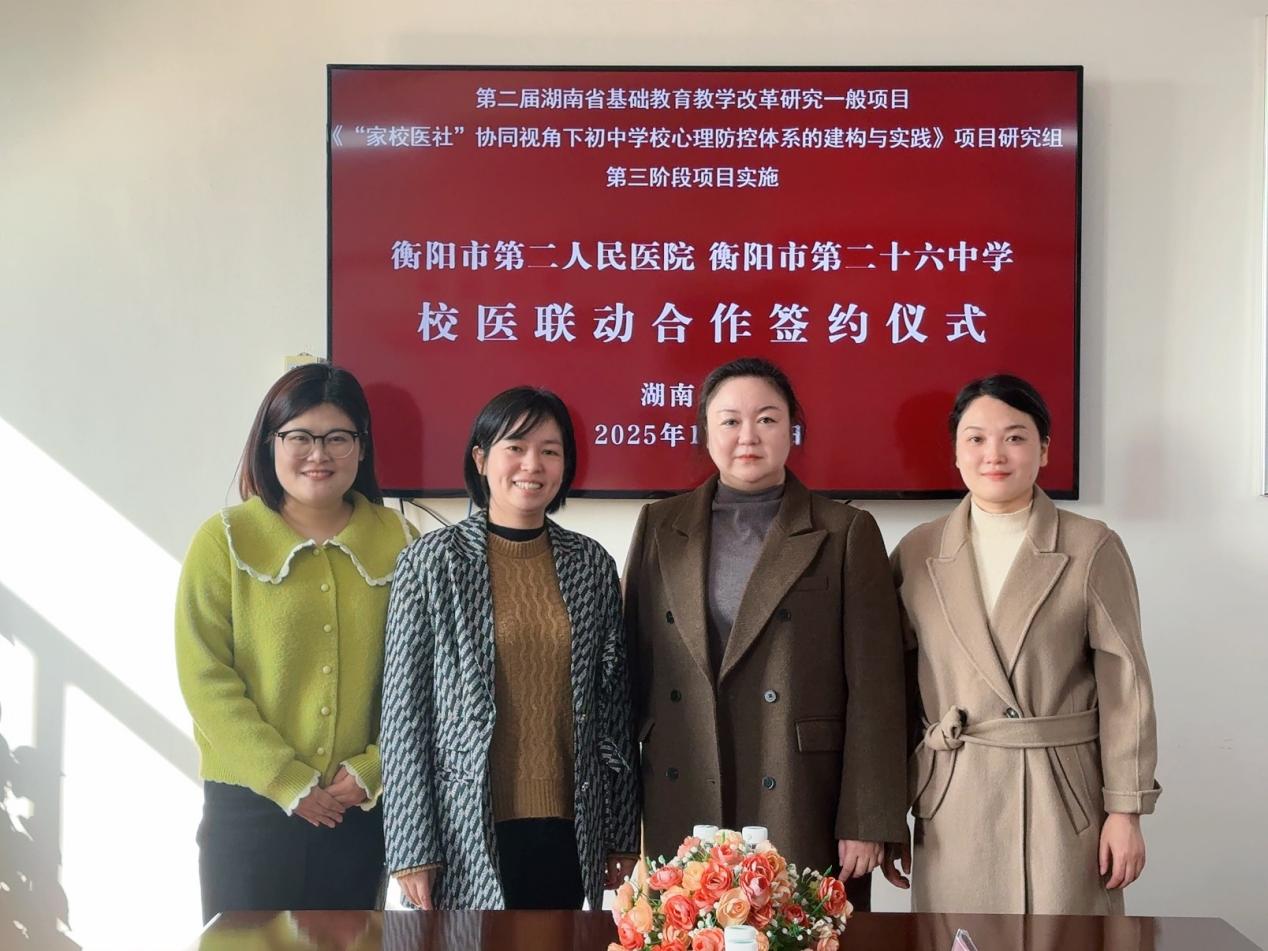 此次医校合作是衡阳市第二十六中学省级科研项目《"家校医社"协同视角下初中学校心理防控体系的建构与实践研究》的重要阶段性成果,标志着学校在构建科学、系统、多元的心理健康防控体系进程中迈出了关键一步。未来,学校将以该项目为引领,持续深化与市第二人民医院的合作,不断优化心理健康教育模式,创新协同育人路径,让专业医疗资源与校园教育场景深度融合,为青少年身心健康发展注入专业力量,护航每一位学子在阳光下茁壮成长。