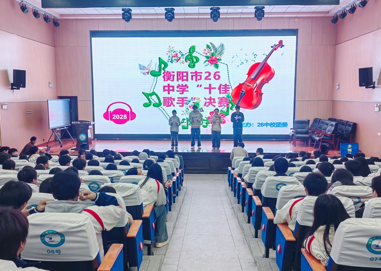 为厚植校园文化底蕴,营造向上向善的育人氛围,搭建学生展示艺术才华的优质平台,2025年12月2日晚,衡阳市第二十六中学"青春放歌,声动校园"校园十佳歌手大赛在学校多媒体报告厅隆重举行。历经近一个月的初赛选拔、复赛比拼,18位实力唱将从数百名报名学子中脱颖而出,登上总决赛舞台,为现场师生呈现了一场精彩绝伦的视听盛宴。