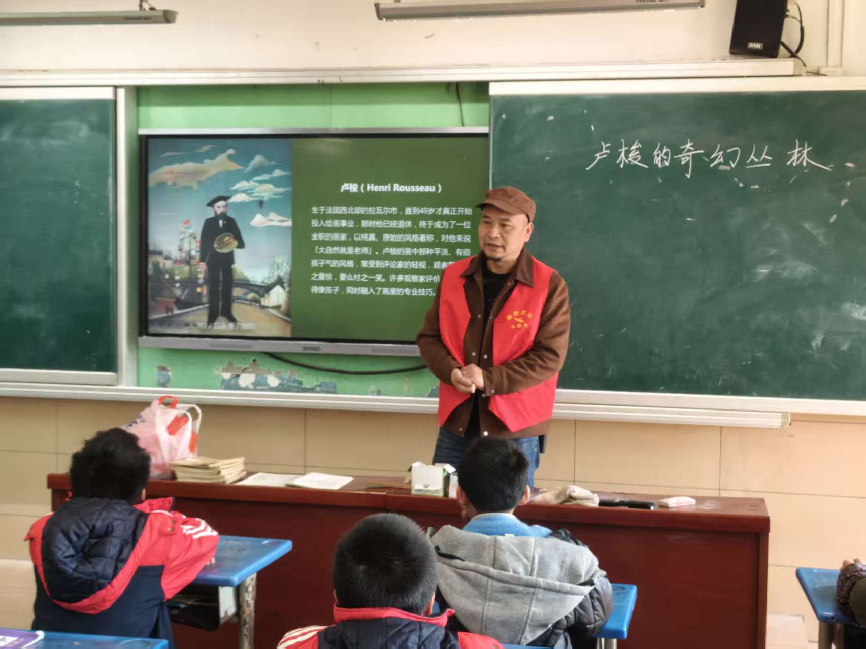 美术教室内,唐立成老师带领学生开启了一场艺术探索之旅,走进卢梭笔下的"奇幻丛林"。他借助一幅幅色彩绚丽的画作,为孩子们介绍了这位从未亲临热带雨林,却在晚年以画笔构筑出充满想象力的奇幻世界的传奇画家。课堂上,唐老师生动解读卢梭兼具纯真童趣与专业技法的艺术特质,引导孩子们领悟"艺术源于热爱,创造无关年龄"的深刻内涵。在老师的指导下,孩子们拿起画笔,用稚嫩的笔触勾勒心中的丛林秘境,让想象力在画纸上肆意绽放。