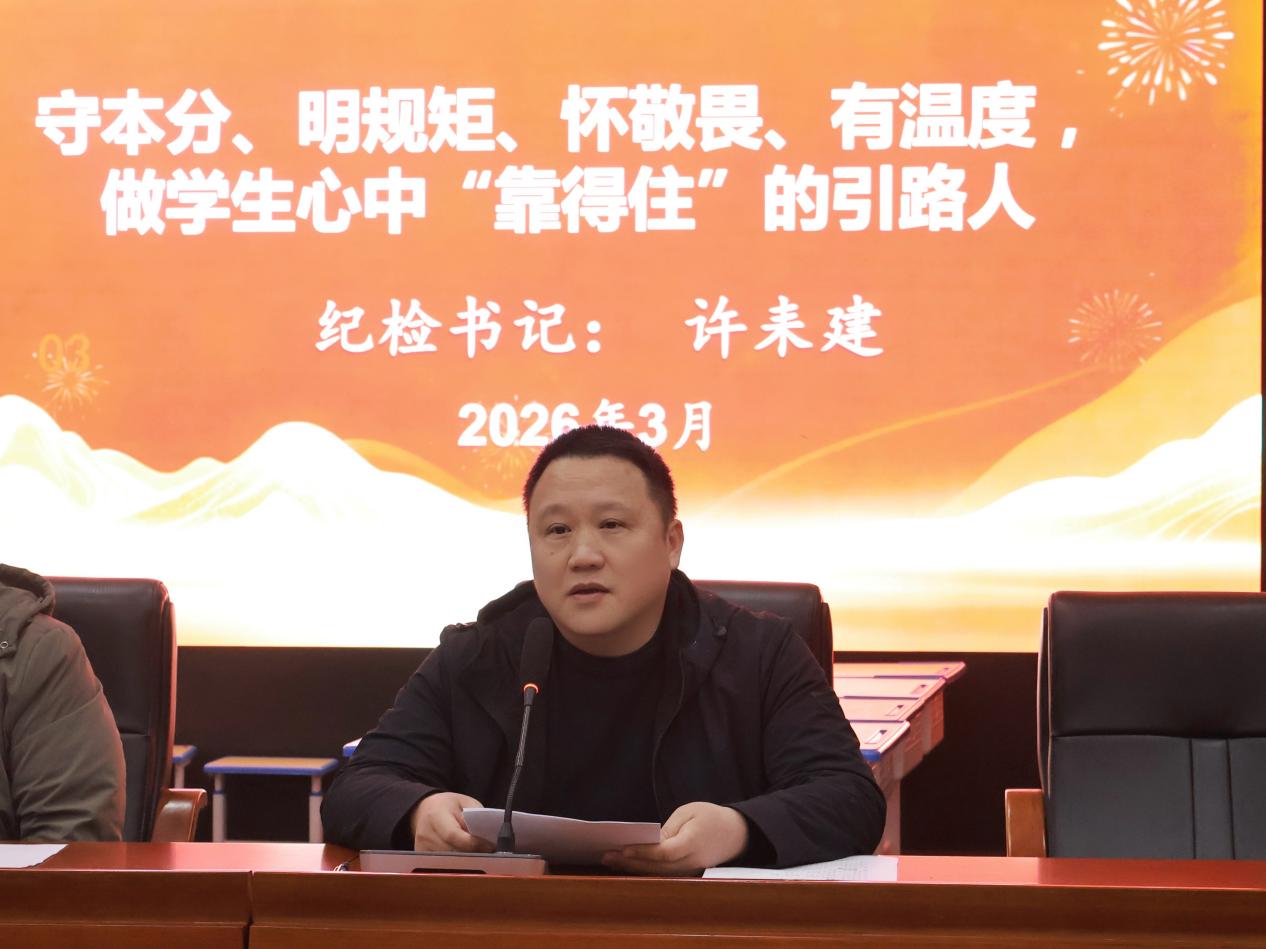学校纪委书记许耒建作师德师风专题讲座,全面总结上学期师德师风工作情况,围绕教师职业规范、警示教育、纪律作风等开展培训,引导教师守本分、明规矩、怀敬畏、有温度,做学生"靠得住"的引路人。随后,全体教师面向国旗庄严宣誓,年级组长代表递交《师德师风承诺书》,以誓言践行初心,以承诺恪守底线。