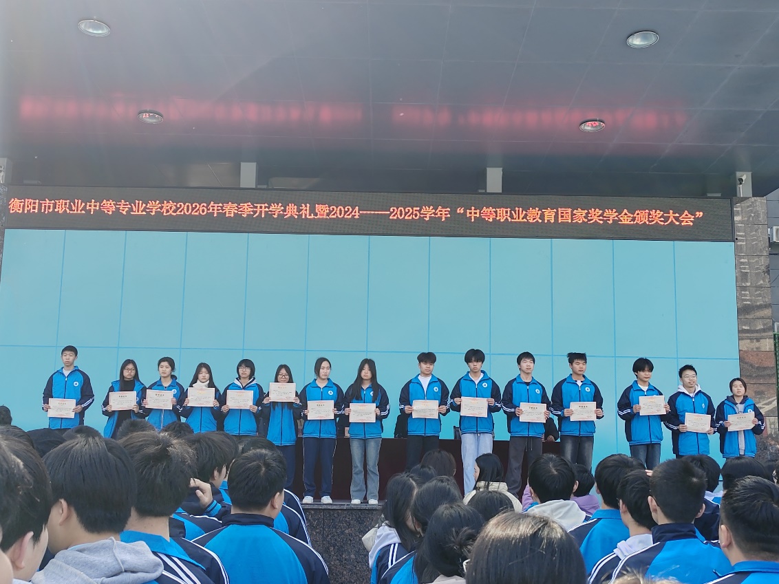 典礼在雄壮的国歌声中拉开帷幕,全体师生肃立注目,精神昂扬。仪式上,纪委书记王新科宣读《关于表彰衡阳市职业中等专业学校2024-2025学年中等职业教育国家奖学金获奖学生的决定》,《衡阳市职业中等专业学校2025年下学期表彰决定》,在热烈的掌声与激昂的音乐中,校领导为国家奖学金获奖学生、三好学生标兵、优秀干部标兵、砺志班学习标兵逐一颁发荣誉证书。证书是勤学苦练的见证,更是青春奋斗的勋章,充分展现了职专学子德技并修、全面发展的良好风貌。