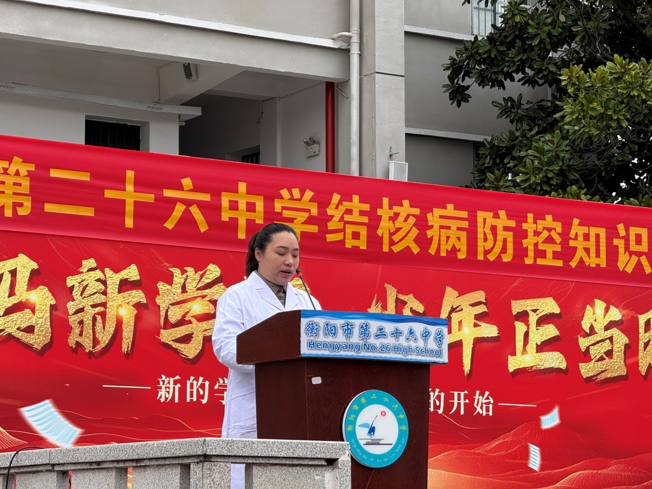 为进一步增强全校师生结核病防治意识,筑牢校园传染病防控安全防线,在世界防治结核病日来临之际,衡阳市第二十六中学联合衡阳市第四人民医院、东阳渡街道第二社区卫生服务中心,共同开展结核病防治知识专题宣传活动。活动特邀东阳渡街道第二社区卫生服务中心副主任谭彦君医生主讲,为同学们带来了一堂生动详实、实用性强的结核病防治科普课。