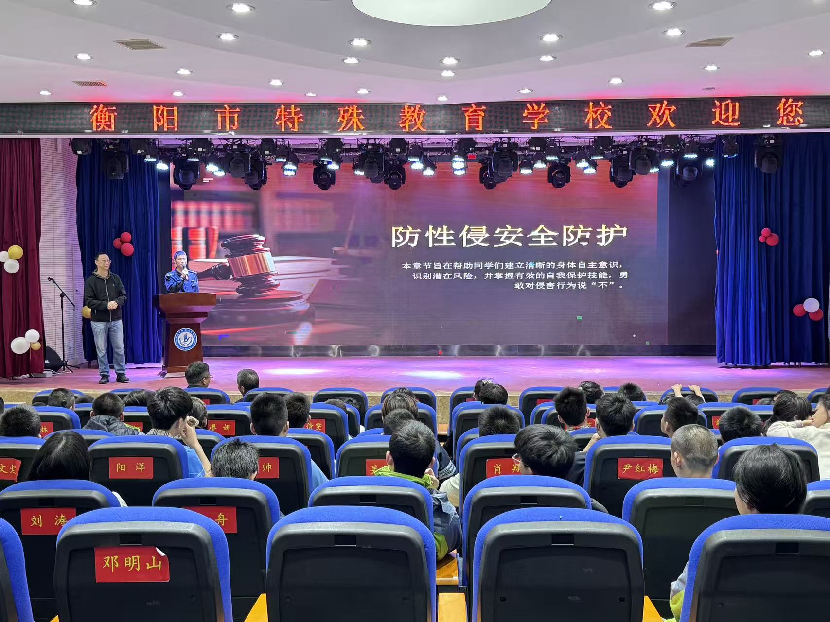 为筑牢特殊青少年法治安全防线,在全民国家安全教育日——4月15日,衡阳市特殊教育学校开展了"知法护己,安全同行"专题普法讲座。衡阳市特殊教育学校法治副校长刘罗军担任主讲,启音、启明部全体学生参加学习,班主任及任课教师全程陪同,手语老师同步提供翻译支持,确保每一位学生都能听懂、学会。