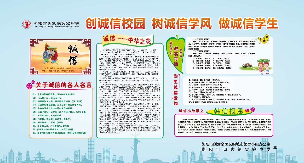 为落实立德树人根本宗旨,弘扬诚信精神,倡树文明新风,加快推进信用衡阳建设,我校积极开展诚实守信宣传教育。