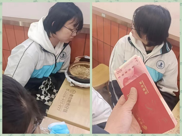 我校学子还积极用实际行动践行诚实守信的传统美德。3月29日,344班汤丹丹同学在外就餐时捡拾到大额现金,她拾金不昧,坐等失主,经过两个小时的等待,终于将捡拾到的钱款还到失主手中。这暖心的一幕被路人拍下,大家对她的高尚品德赞不绝口,也对我校诚信教育的丰硕成果竖起了大拇指。